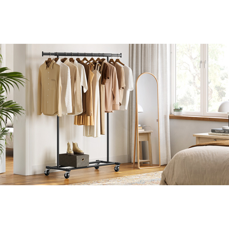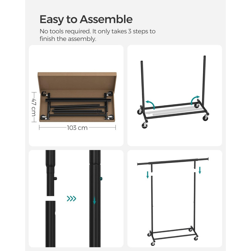 Usor de mutat si blocat: aceasta sina pentru haine este dotata cu 4 roti pivotante la 360°, dintre care 2 se pot bloca, permitandu-va sa o mutati cu usurinta din dormitor in garderoba si sa o blocati pe loc daca este necesar.Usor de asamblat si depozitat: Nu sunt necesare instrumente pentru a configura aceasta sina de imbracaminte si poate fi gata in doar 3 pasi! Cand nu este folosit, il puteti dezasambla si pune deoparte sub pat sau intr-un colt nefolosit rapid pentru a economisi spatiu