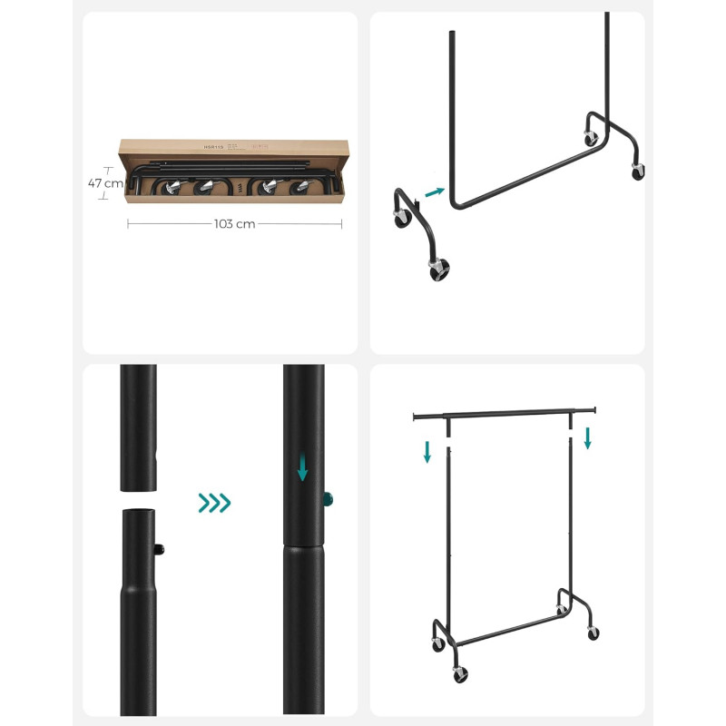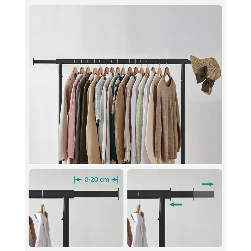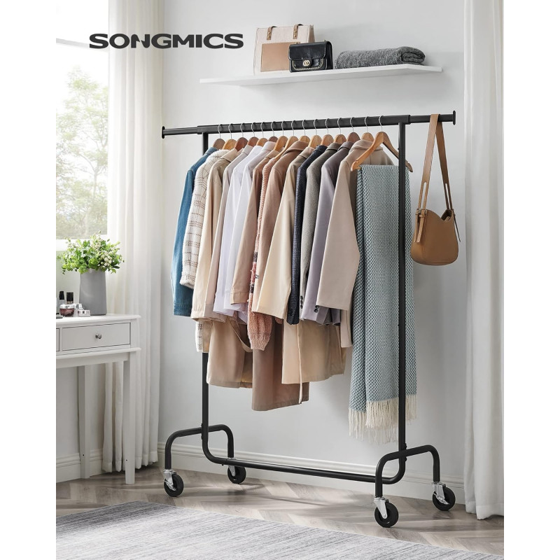 Scurta descriere: Suportul pentru haine SONGMICS este o solutie practica si rezistenta pentru organizarea hainelor in dormitor, dressing sau spalatorie. Bara extensibila permite ajustarea lungimii pentru mai mult spatiu de agatare, iar structura din metal gros ofera stabilitate si sustine pana la 136 kg. Dotat cu 4 roti pivotante, dintre care 2 cu frana, suportul poate fi mutat usor si fixat in siguranta. Se monteaza rapid, fara unelte, si poate fi demontat pentru depozitare compacta.