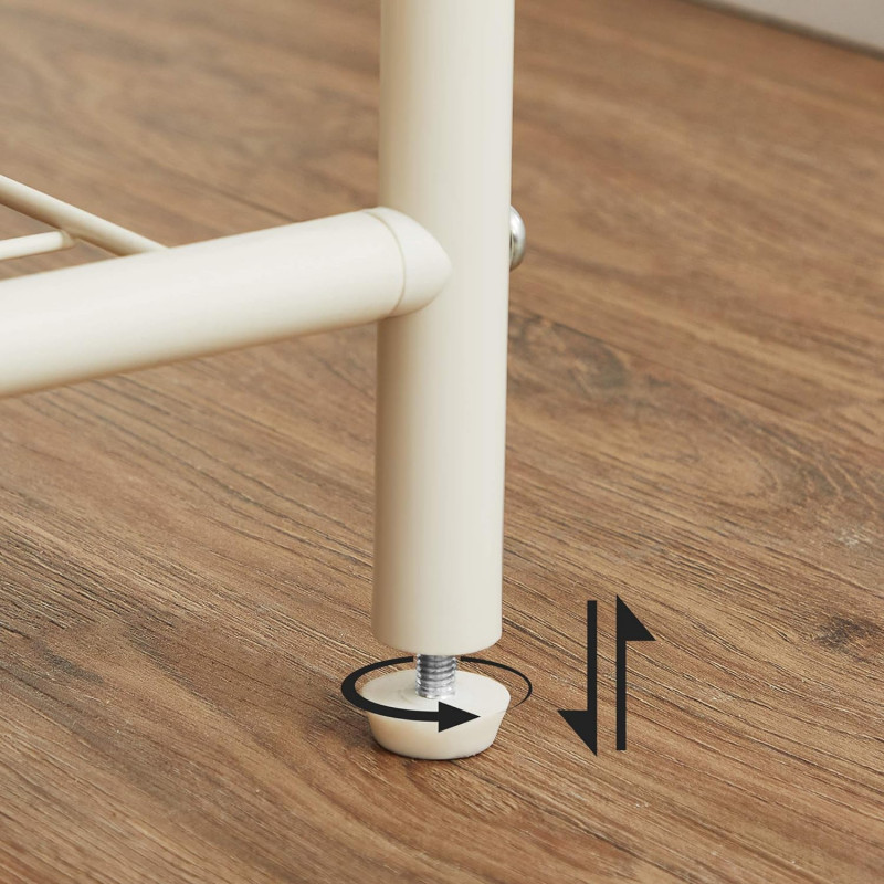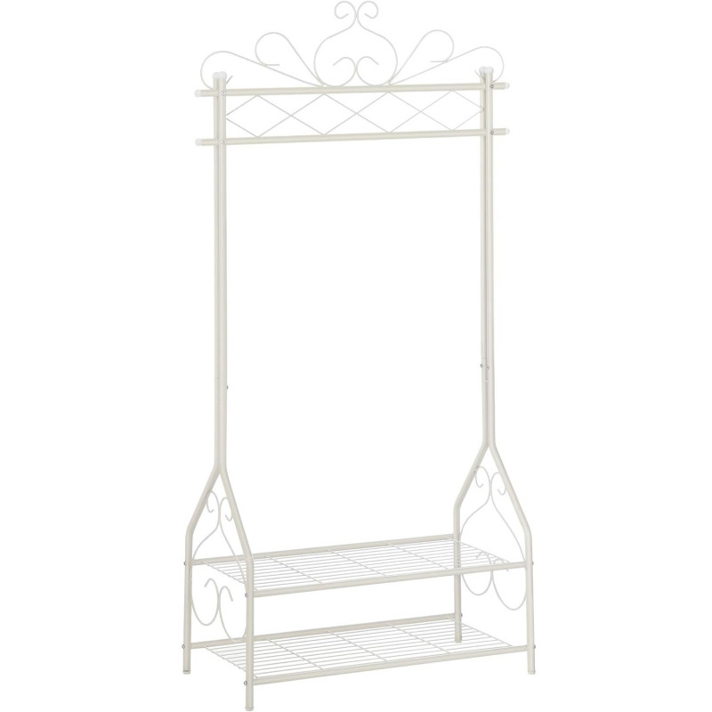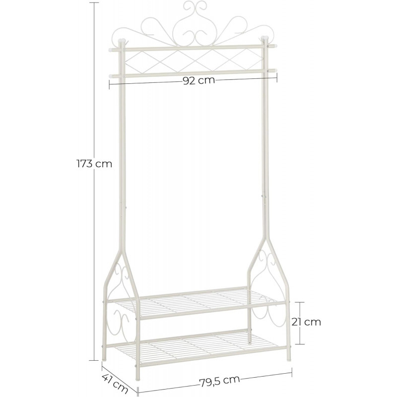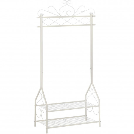 Material: Metal Un accesoriu luminos pentru casa dvs., cu elemente decorative curbate in partea de sus si de jos, cuierul in stil vintage va va infrumuseta holul, dressingul, dormitorul. Combina bara de haine si rafturile intr-un singur cadru. In partea de sus puteti agata haine, palarii si genti; pantofii si cutiile sunt asezate pe cele 2 rafturi mari. Stalpul superior are o sarcina maxima de 25 kg, fiecare raft inferior de 10 kg. Datorita dimensiunilor de 92 x 173 x 41 cm (latime x inaltime x adancime), cuierul metalic se potriveste in orice colt.Stabil: 4 picioare antiderapante reglabile pe inaltime asigura stabilitatea chiar si in cazul unei podele usor denivelate; 2 tije verticale pe fiecare parte sporesc stabilitatea.Usor de asamblat. Fiecare articol este numerotat. Instructiunile ilustrate incluse va ajuta sa il asamblati.