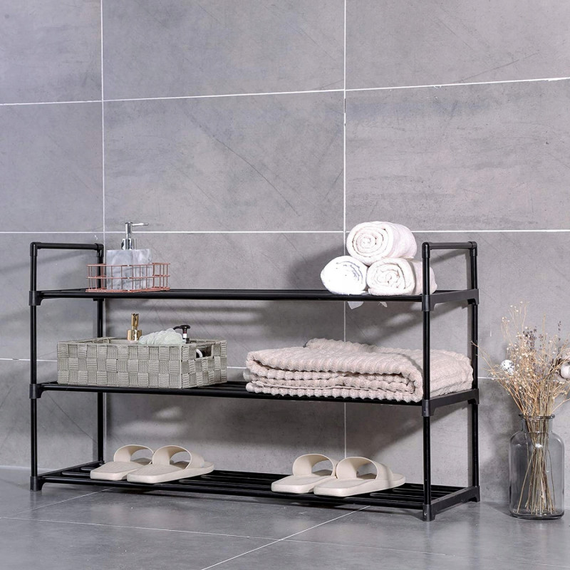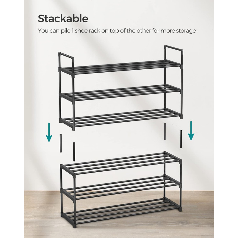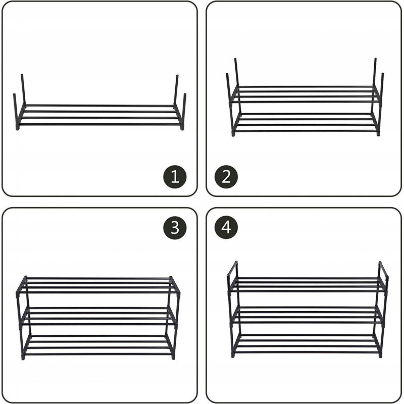 Dimensiune: 30 cm Acest suport de pantofi minimalist cu 3 nivele va permite sa va organizati pantofii intr-un mod simplu si elegant. Fabricat din tuburi metalice cu diametrul de 14 mm si conectori din plastic de inalta calitate, acest suport robust poate sustine pana la 12 kg in total (4 kg pe fiecare raft). Fiecare raft poate gazdui 5 perechi de pantofi de dama sau 4 perechi de pantofi de barbati, iar atunci cand pozitionati raftul cu susul in jos, spatiul suplimentar va permite sa depozitati adidasi si flip flop-uri sub raftul inferior. Kitul este insotit de