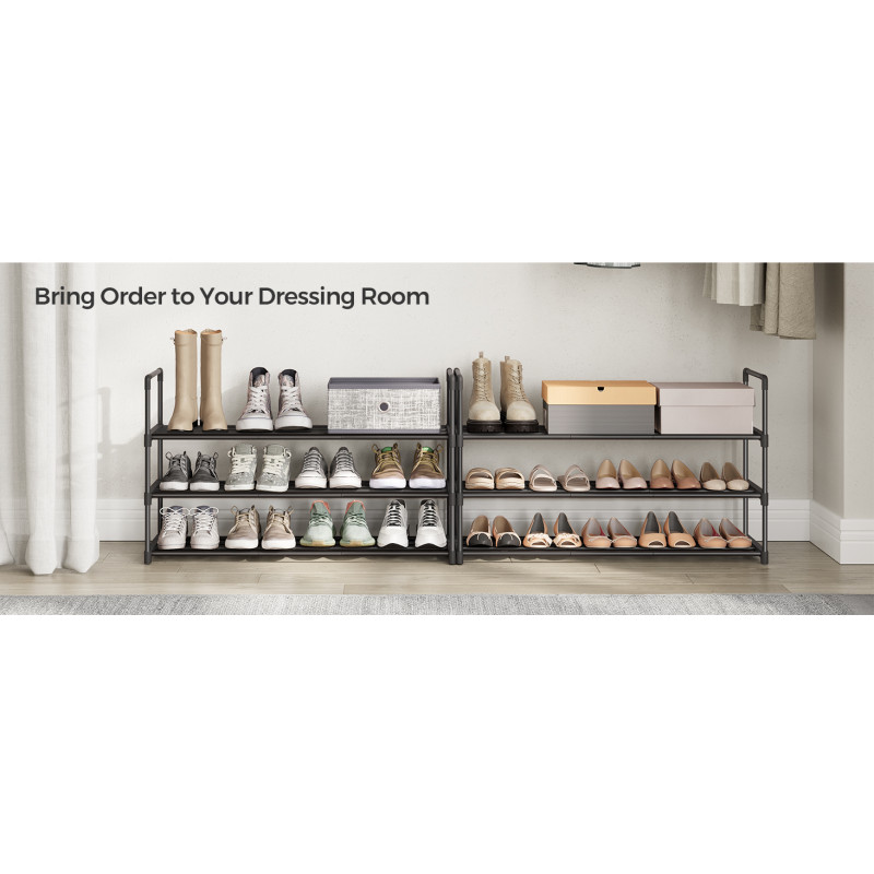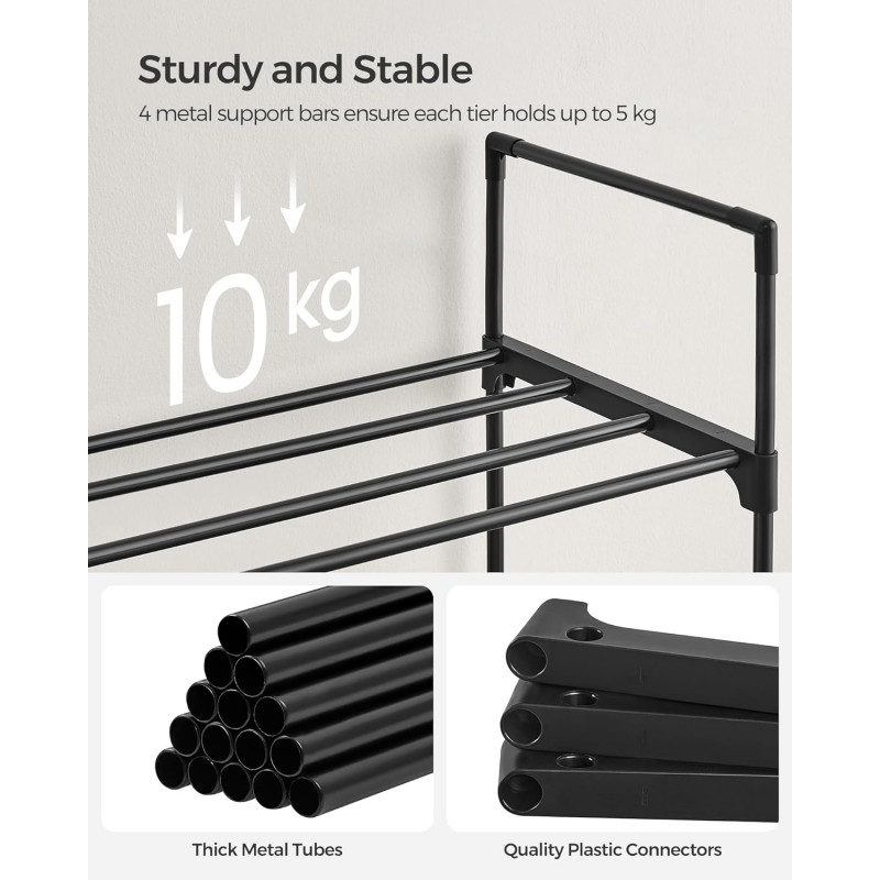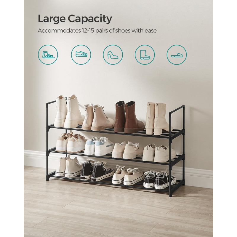 Stil: modern Despre acest articol Cu dimensiuni de 92 x 30 x 55 cm, acest suport de pantofi pe 3 niveluri poate sustine pana la 12 perechi de pantofi de barbati sau 15 perechi de pantofi de femei. Va ajuta sa va pastrati pantofii organizati si usor de accesat.Tuburile metalice groase imbinate cu conectorii din plastic de calitate fac un raft de pantofi solid. Fiecare nivel suporta pana la 10 kg, oferind pantofilor dvs. un suport puternic.Cu un strat neted, acest organizator pentru depozitarea pantofilor este usor de curatat. Liniile simple si o constructie care economiseste spatiu fac din acest raft metalic o solutie de depozitare perfecta pentru hol, dormitor, dulap sau chiar si pentru camera dvs. de zi.