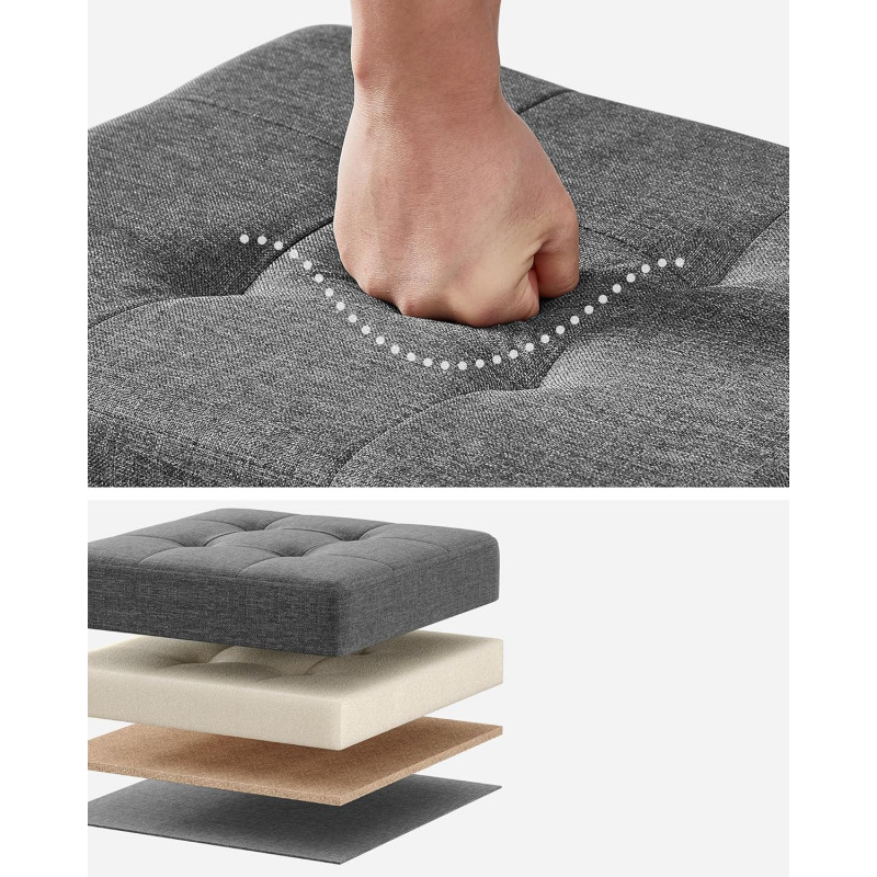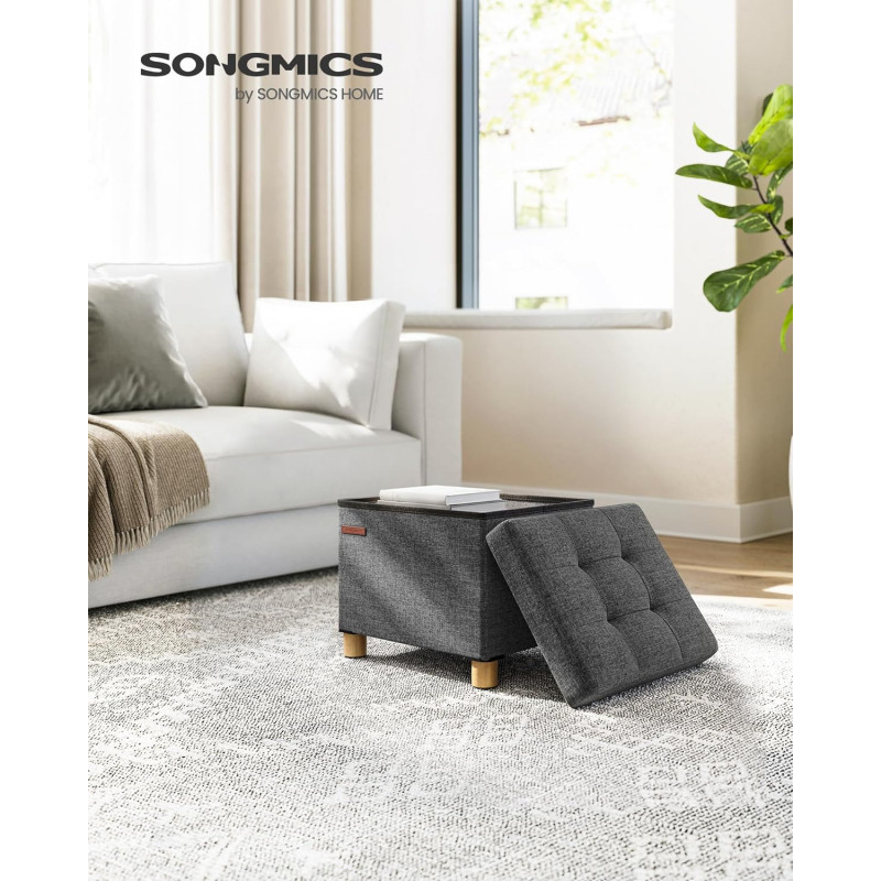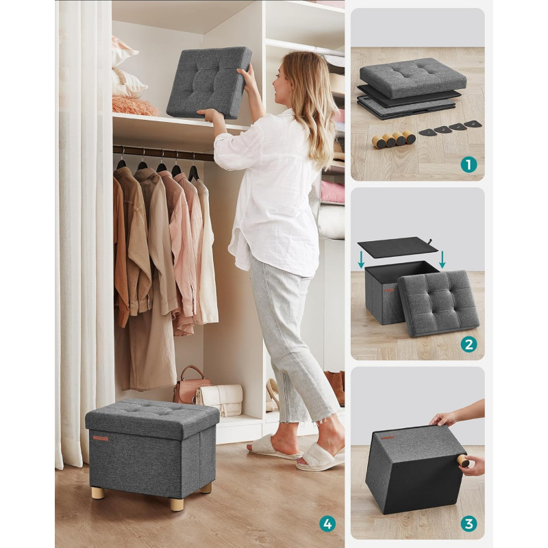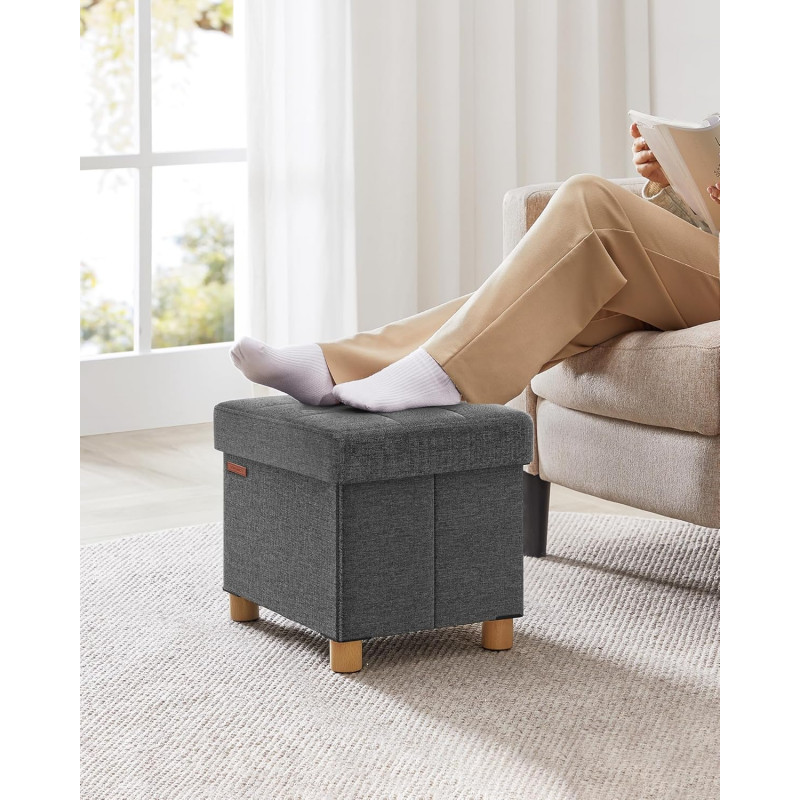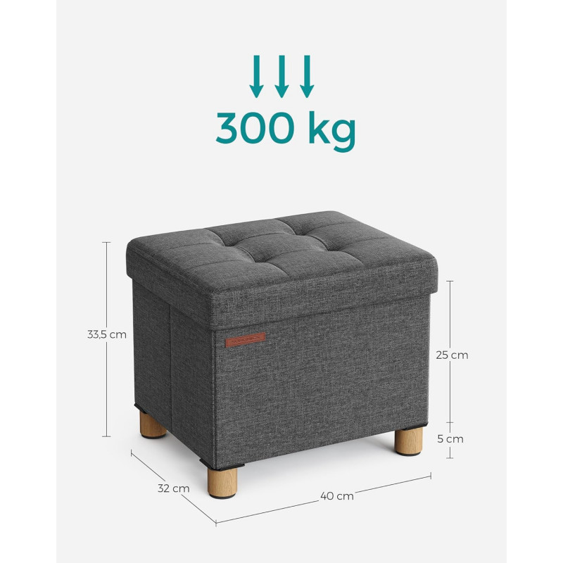 Scurta descriere Taburetul de depozitare SONGMICS este o solutie multifunctionala si practica pentru orice locuinta. Cu un design elegant in tesatura tip in, ofera spatiu generos de depozitare, confort la sezut si se pliaza usor atunci cand nu este folosit. Picioarele din lemn adauga stabilitate si protejeaza pardoseala.
