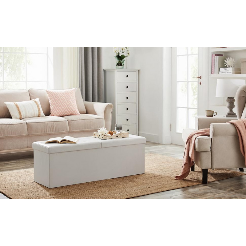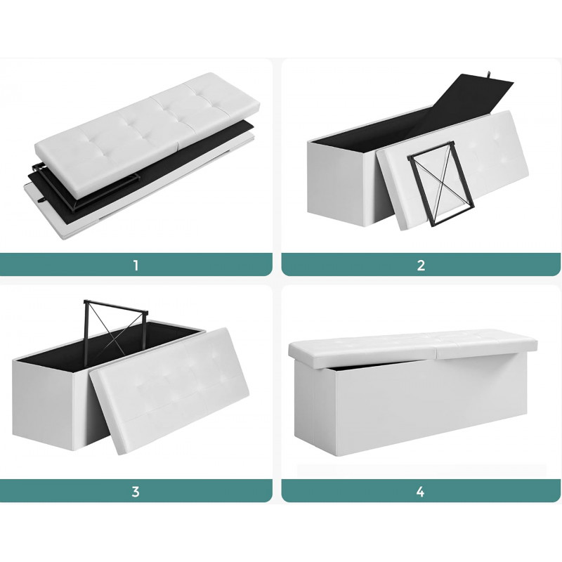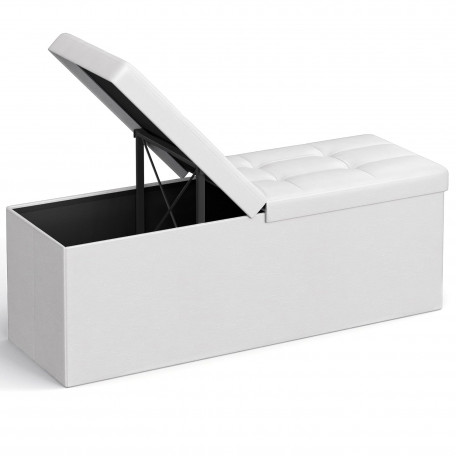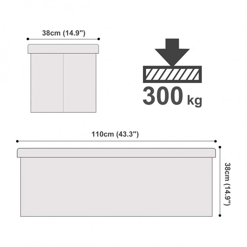 Volum: 131 L Despre acest articol Asezati acest taburet de depozitare in dormitor ca o banca la capatul patului, in fata canapelei din camera de zi ca un suport pentru picioare sau pe hol ca o banca pentru pantofi - dumneavoastra aveti ultimul cuvant! Cadrul acestui taburet de depozitare este fabricat din MDF de calitate, care este suficient de puternic pentru a sustine pana la 300 kg, astfel incat sa puteti sta pe el fara griji.Desfasurati aceasta cutie de depozitare, introduceti placa de baza solida si veti avea un spatiu de 33.5 x 107 x 33.5 cm pentru depozitarea lenjeriei de pat, a cartilor sau a hainelor.