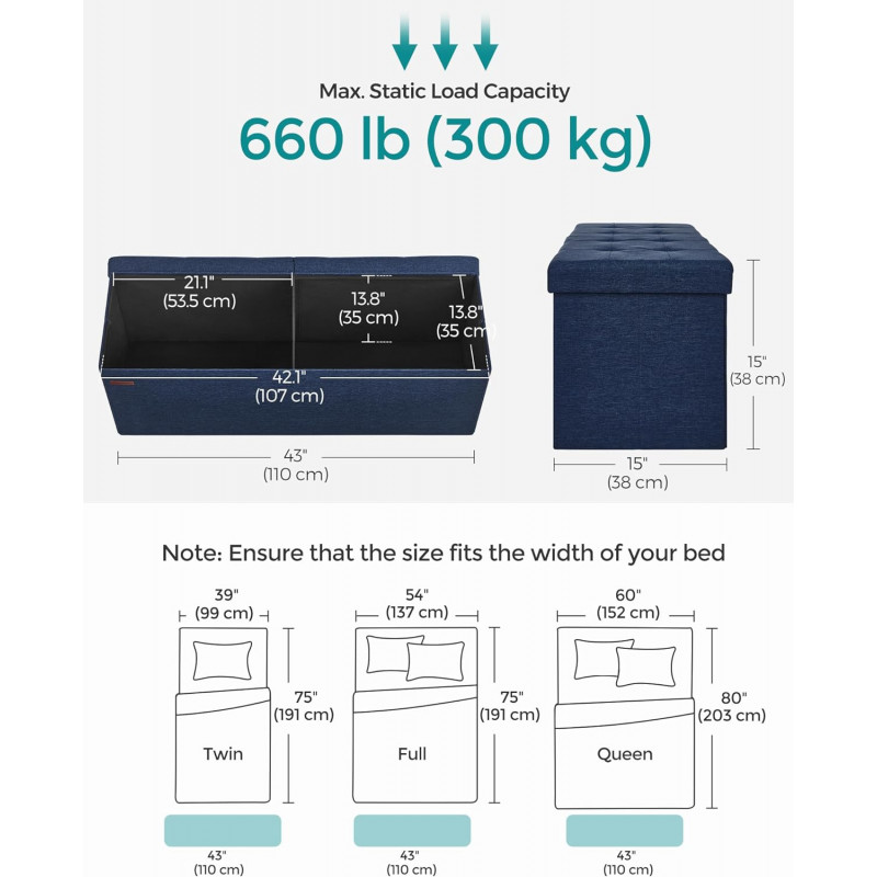 Mult spatiu de depozitare: Acest pouf pliabil, cu dimensiunile 38 x 110 x 38 cm si o capacitate totala de 35 galoane, poate fi folosit pentru a va organiza cu grija cearsafurile de pat, pernele, paturi, reviste si multe altele.