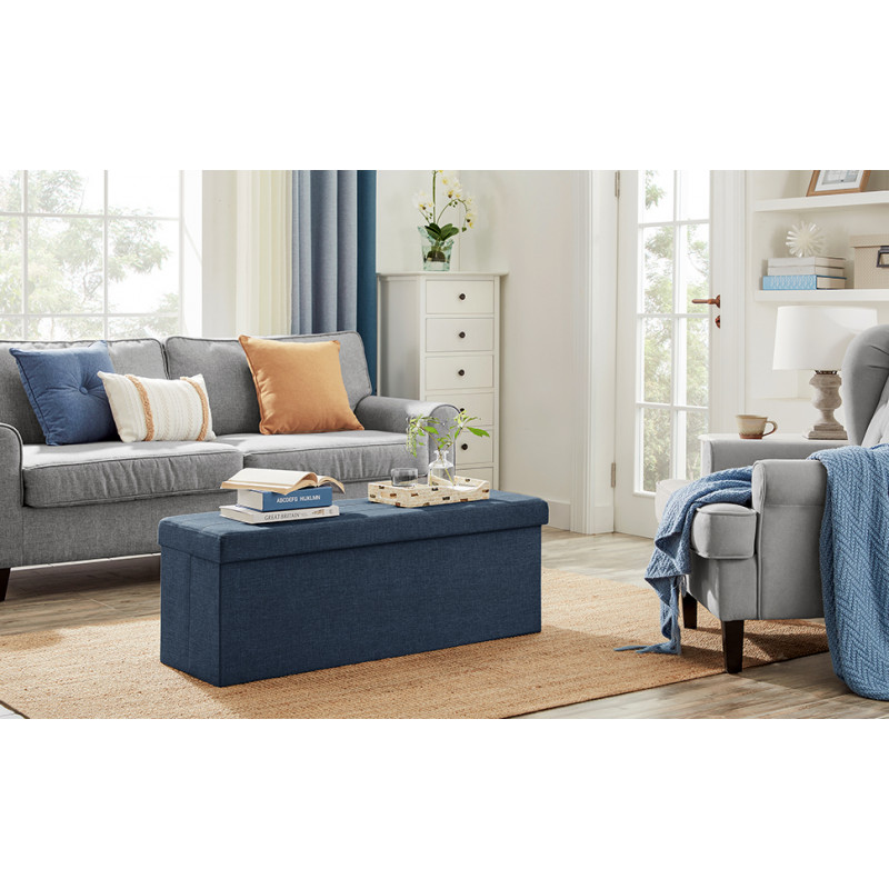 Elegant si solid: Acest pouf de depozitare are o tesatura eleganta cu aspect de in, cu cusaturi fine. Aparatoarele de colt metalice ajuta la intarirea capacului si placile groase din MDF sustin partea superioara si laterala.
