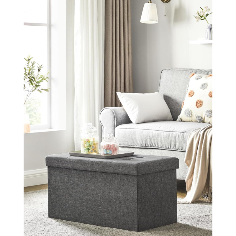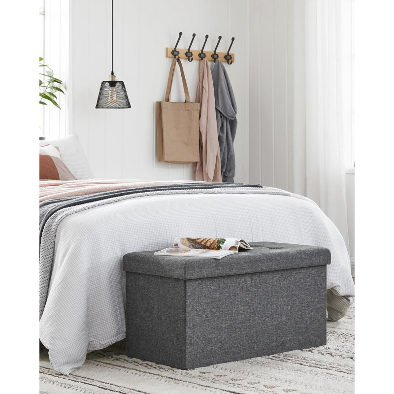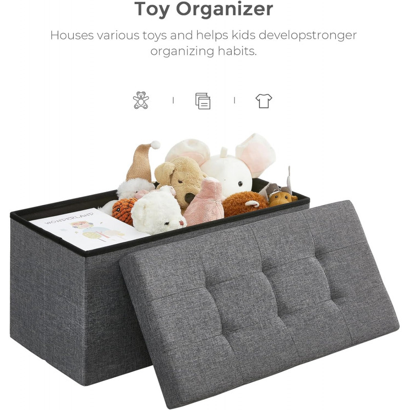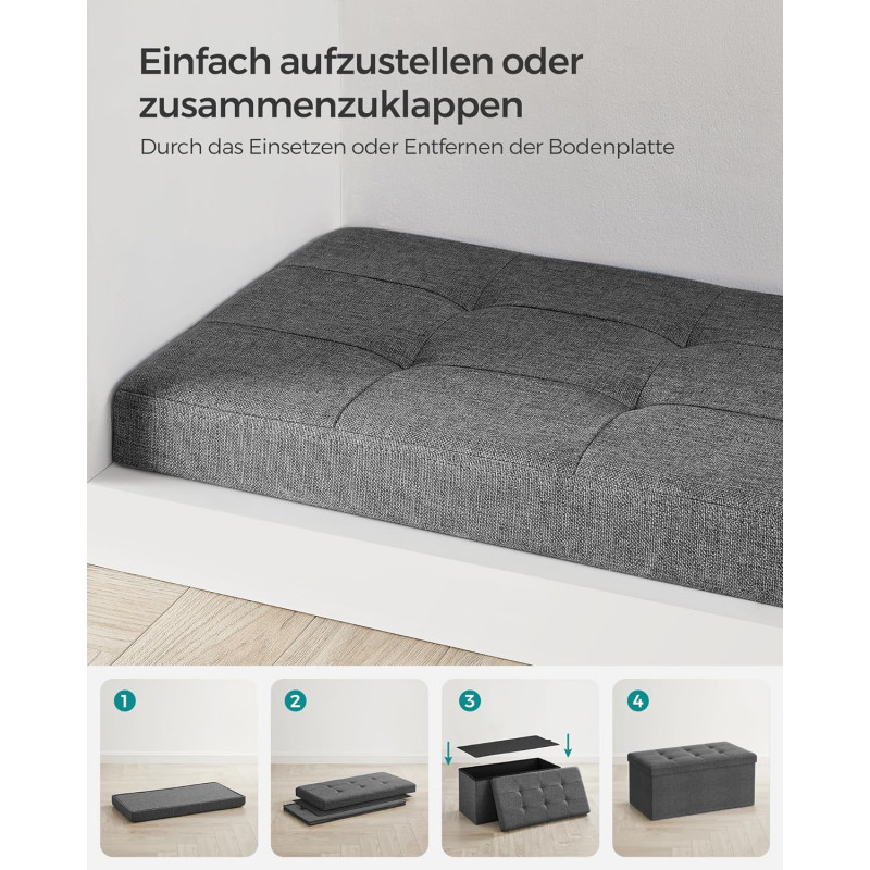 Material primar: Lemn proiectat Despre acest articol Culoarea moderna gri inchis si smocuri in stil chesterfield de pe scaunul tapitat confortabil fac din aceasta banca o atragere a ochiului in orice camera, avand in acelasi timp o functionalitate impresionanta si o capacitate mare de incarcare.La capatul patului tau? unde ai vrea sa pui acest pouf de depozitare? fie in camera de zi vizavi de canapea sau pe hol de langa dulap, singura limita a ingeniozitatii tale este imaginatia ta.Depozitati intr-un mod diferit: in dormitorul dvs., aveti de obicei un dulap mare pentru haine, lenjerie de pat si cutii. Cu toate acestea, in timp ce vechiul dvs. este deja plin, acest cufar de 80 de litri va ofera mai mult spatiu de depozitare.Partea inferioara a bancii poate fi pliata, astfel incat sa puteti depozita piesa de mobilier intr-un mod economisind spatiu atunci cand nu este utilizata, cum ar fi sub patul dvs. sau pe un raft din dulap.