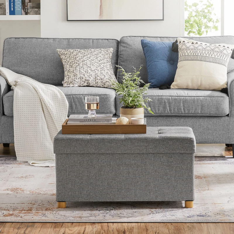 Sarcina statica max: 300 kg Design elegant si confort ridicat al sezutului : Scaunul are o suprafata chic din imitatie de in cu design matlasat si adauga stil camerei dvs. Tesatura dublu stratificata si spuma foarte elastica asigura un confort de sedere de lunga durata Pentru o durata de viata indelungata Gratie placilor robuste din MDF si armaturilor metalice de la colturile capacului, acest taburet poate sustine cu usurinta pana la 300 kg - o solutie durabila si fiabila de sedere sau depozitare pentru dvs. Spatiu de depozitare suficient Cu dimensiunile de 38 x 76 x 40 cm, aceasta banca de sedere ofera un spatiu mare de depozitare de 77 L pentru carti, paturi si lenjerie de pat. De asemenea, vine cu o partitie detasabila pentru a va stoca articolele sortate Picioare din lemn solid Cu cele 4 picioare din lemn, podeaua de sub banca de picioare este usor de curatat. Fiecare picior este echipat cu o talpica antiderapanta, care ofera stabilitate suplimentara si protejeaza podeaua de zgarieturi Utilizare versatila Acest taburet pliabil serveste ca cutie de depozitare, suport pentru picioare si, de asemenea, ca masa de cafea! Se potriveste perfect in camera de zi, dormitor, intrare sau dressing pentru a satisface diferite nevoi