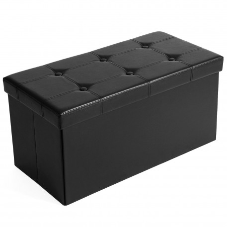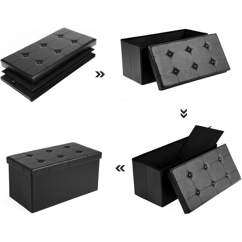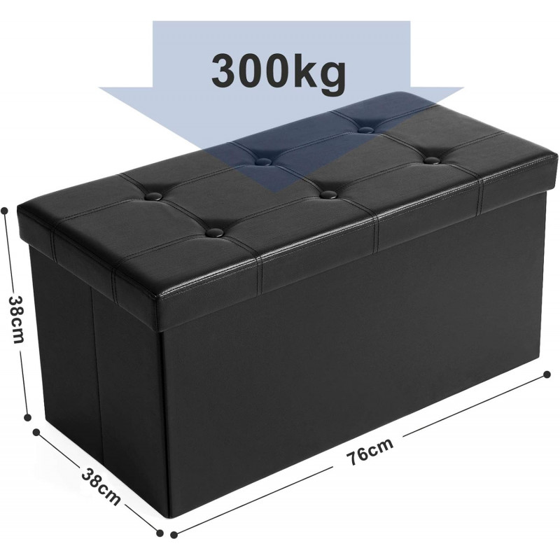 Dimensiune: 76 X38 X38 cm Despre acest articol Asezati acest taburet pliabil la capatul patului in dormitor ca o lada de pat, in fata canapelei in camera de zi ca un taburet pentru picioare sau in hol ca o banca pentru pantofi.Aceasta cutie de depozitare este fabricata din panouri MDF de inalta calitate. Acest lucru creeaza o constructie stabila si solida care poate fi incarcata cu pana la 300 kg (sarcina statica maxima). Scaunul este captusit cu spuma de inalta densitate de 25 mm grosime - isi pastreaza forma si delicatetea. Deci, puteti sta confortabil pe acest taburet.Mai multe optiuni: desfasurati acest cufar, puneti placa de baza solida in el si aveti la dispozitie 80 de litri pentru a depozita lenjerie de pat, carti sau haine. Taburetul poate fi pliat si asezat sub pat sau pe raftul din dulap atunci cand nu este utilizat pentru a economisi spatiu, fiind in acelasi timp usor de transportat.