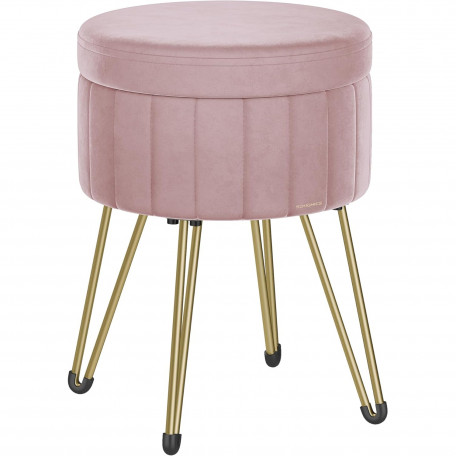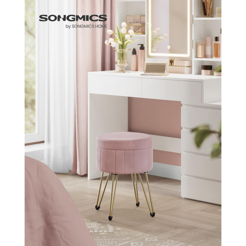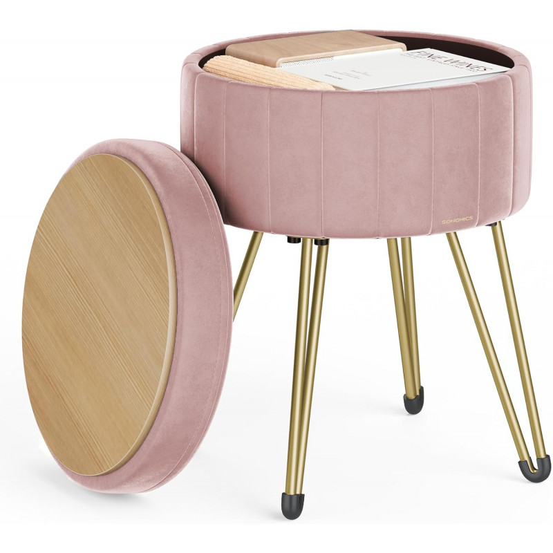 Scurta descriere: Acest taburet rotund din catifea de la SONGMICS aduce un plus de stil si functionalitate spatiului tau. Poate fi folosit ca scaun de machiaj, suport pentru picioare sau masuta laterala, avand un capac detasabil si un compartiment ascuns pentru depozitare.