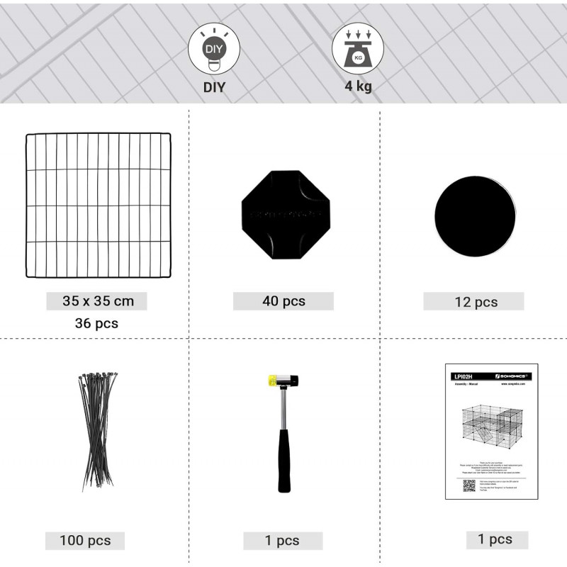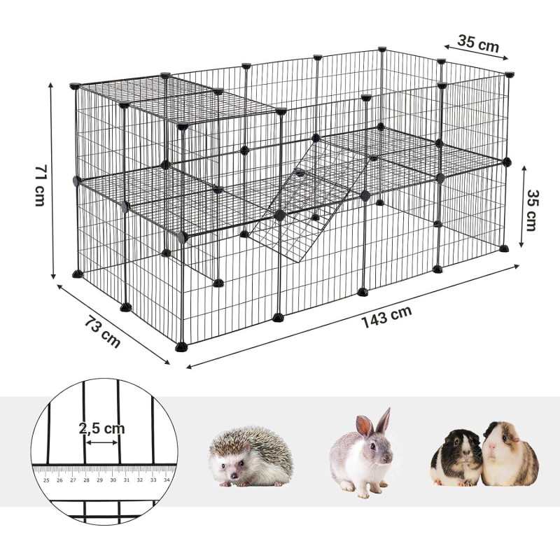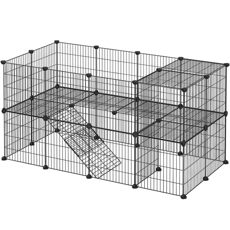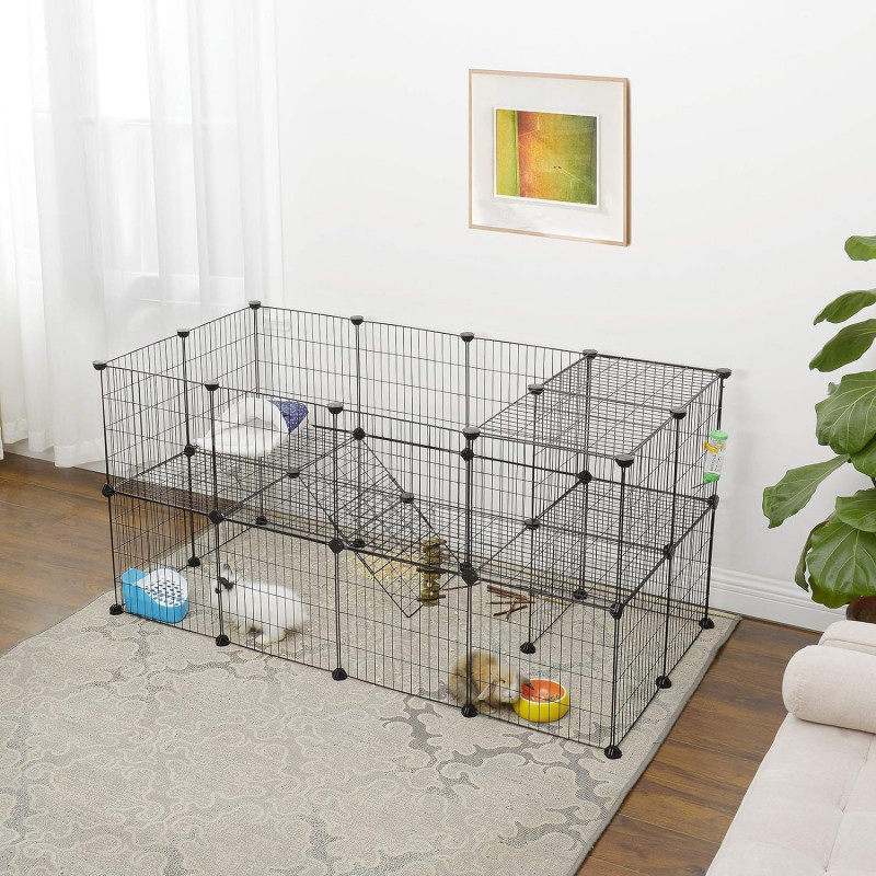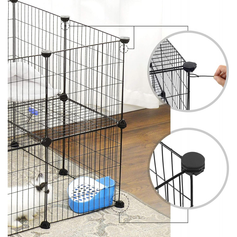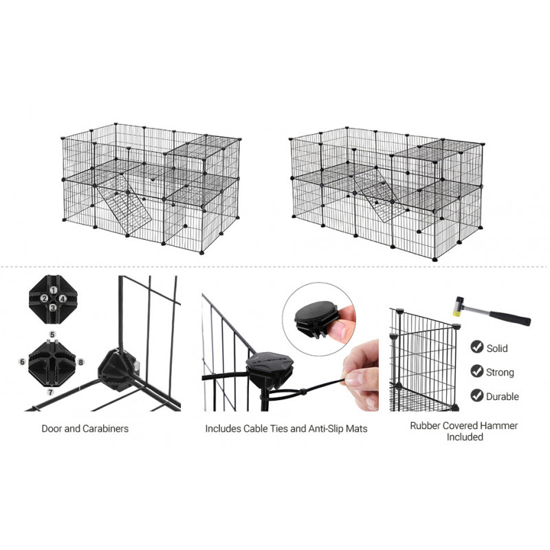 Stil: Single Despre acest articol Toti am dorii ca micul nostru animal sa se simta ca acasa. Creati o casa eleganta, personalizata, cu forma preferata a animalului dvs. de companie datorita carcasei negre pentru animale de companie cu doua etaje Gata intr-un moment: Crearea unui gard DIY este simpla si distractiva! Pur si simplu conectati cele 36 de panouri din plasa de sarma cu cei 40 de conectori.Nu cumpara un gard care s-ar putea prabusi la cea mai mica miscare, terorizandu-ti micul prieten; Conectorii nostri sunt fabricati din plastic ABS rezistent pentru a mentine panourile mai stabile.Toate animalele mici vor avea in sfarsit propriile locuri pentru a se juca in siguranta. Distanta dintre ochiuri a fost redusa la 2,5 cm pentru a preveni blocarea picioarelor celor mici, mentinand in acelasi timp gardul aerisit si sub ochiul tau atent.Ce primesti: 36 de panouri de plasa de sarma, 40 de conectori din plastic, 12 placute de pasla antiderapante, 100 de cleme, 1 ciocan de cauciuc si o modalitate excelenta de a-ti rasfata animalele de companie!