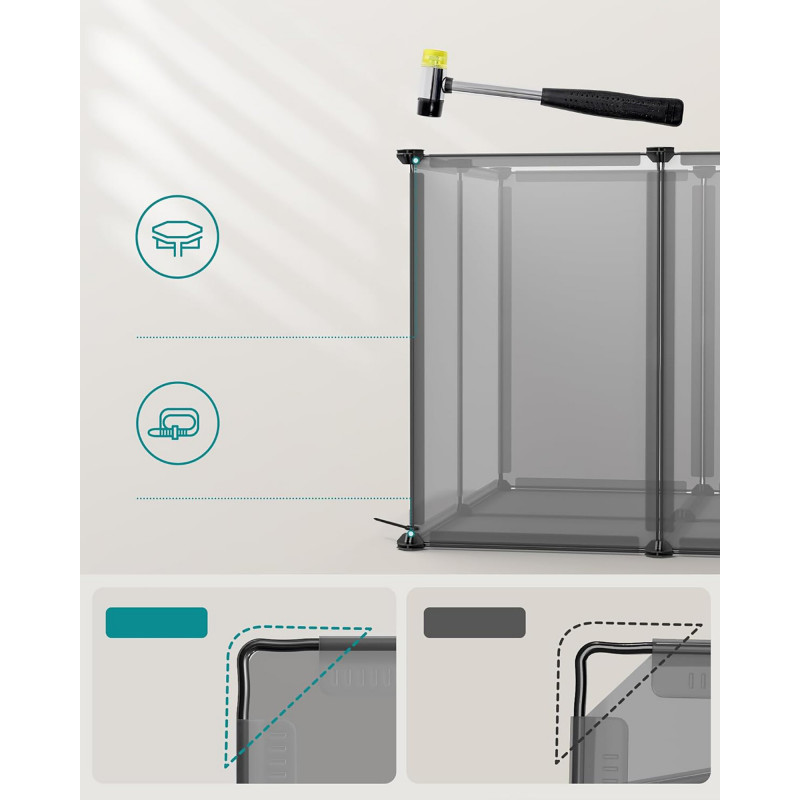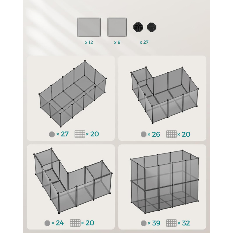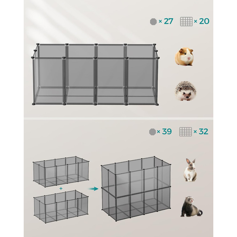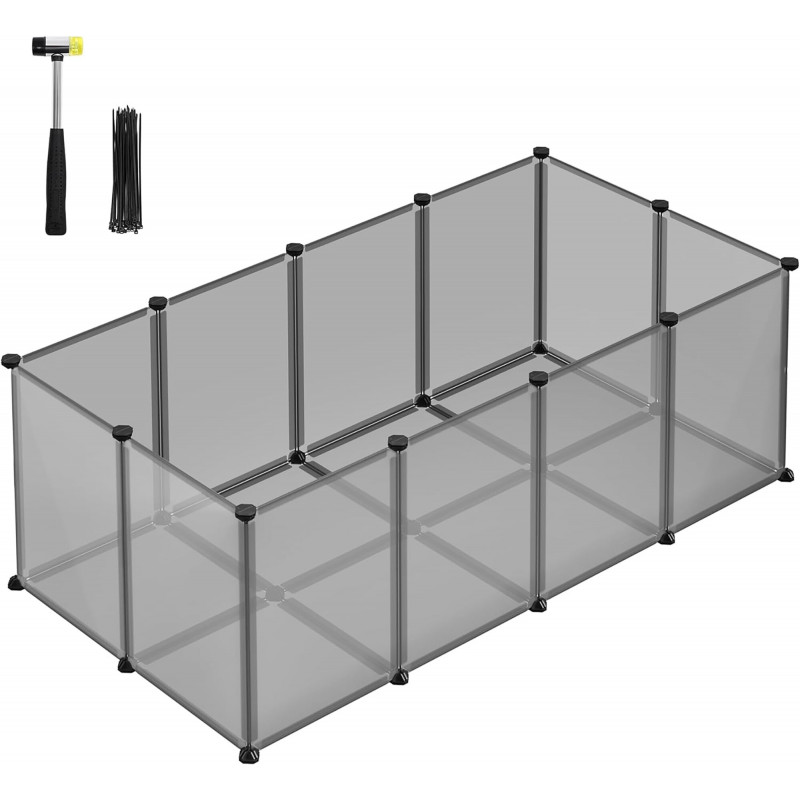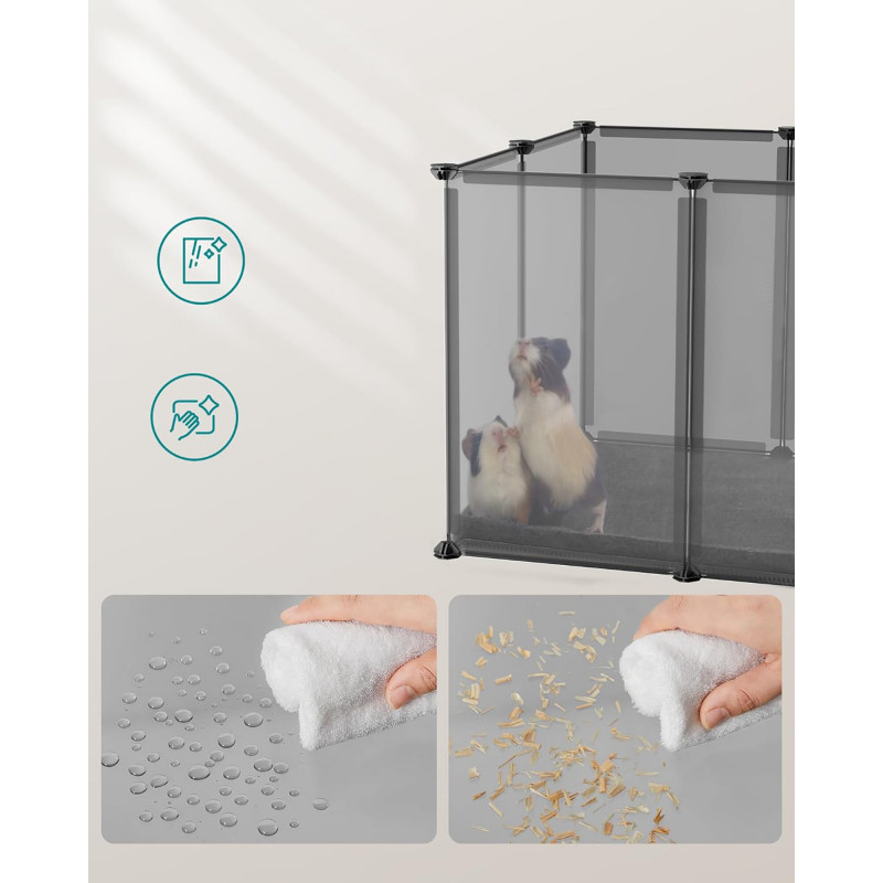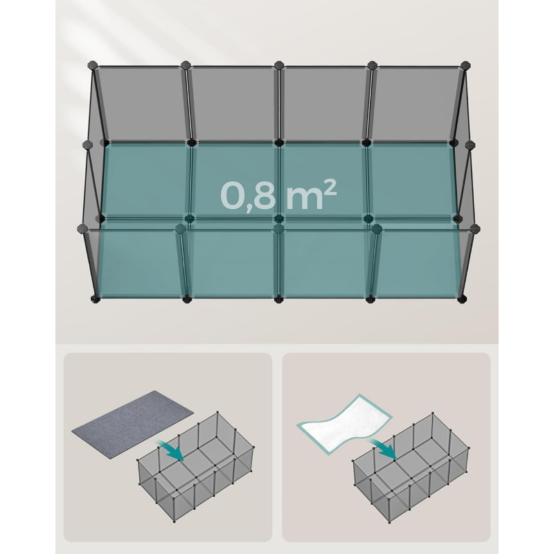 Scurta descriere: Acest tarc modular SONGMICS ofera un spatiu sigur si personalizabil pentru animalele mici. Ideal pentru utilizare in interior, include panouri translucide usor de curatat si o baza ce protejeaza podeaua, oferind in acelasi timp stabilitate si siguranta.