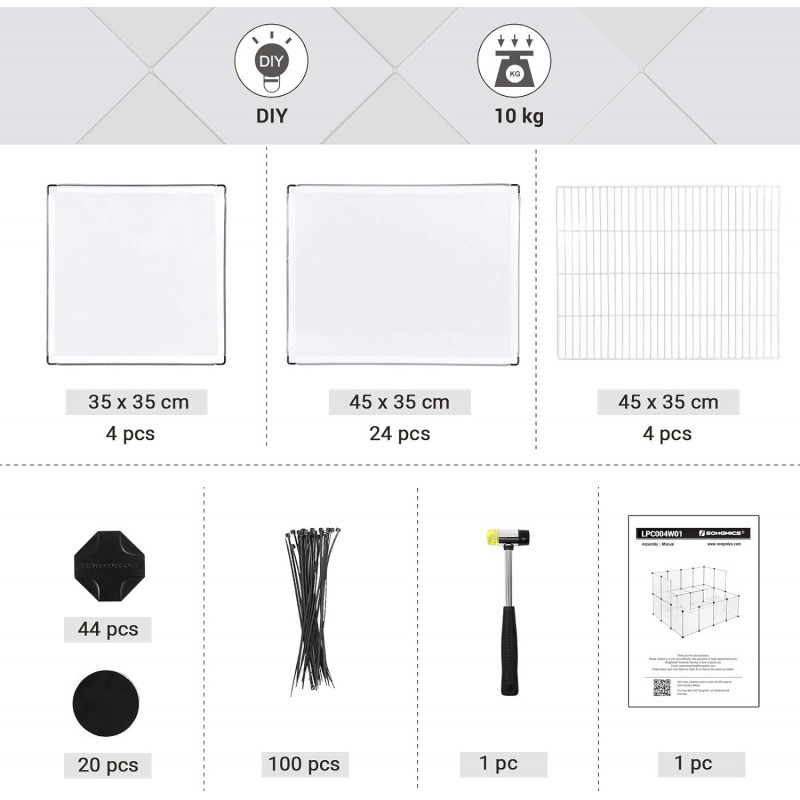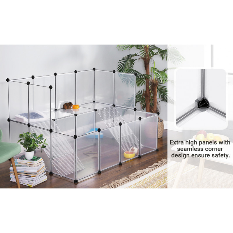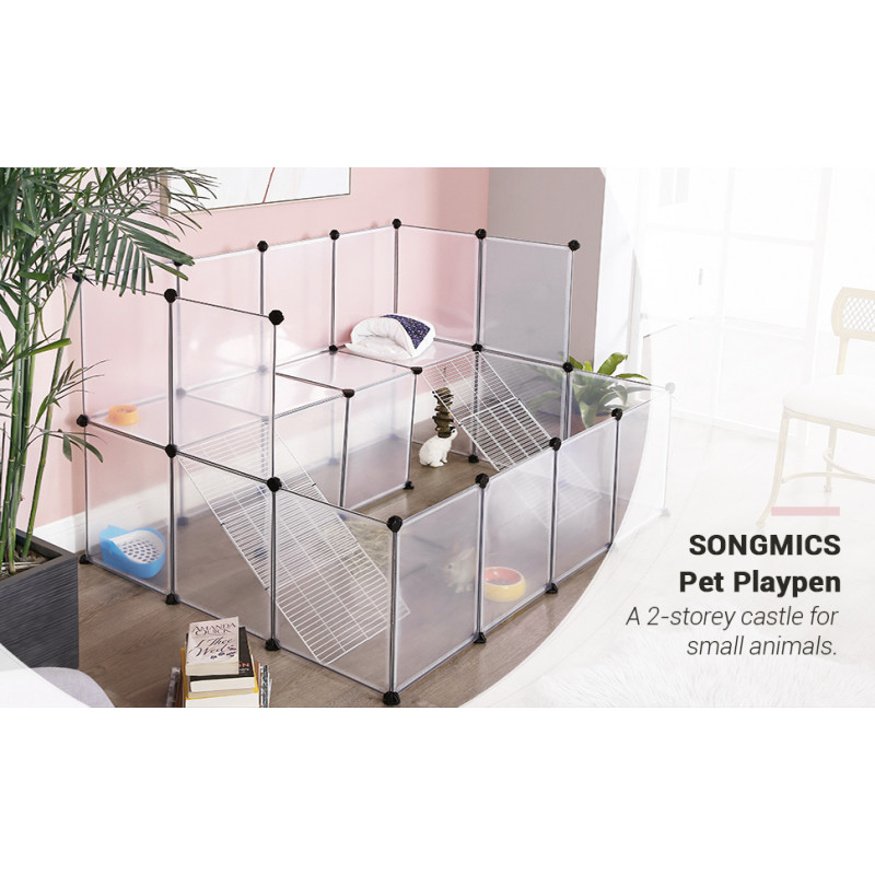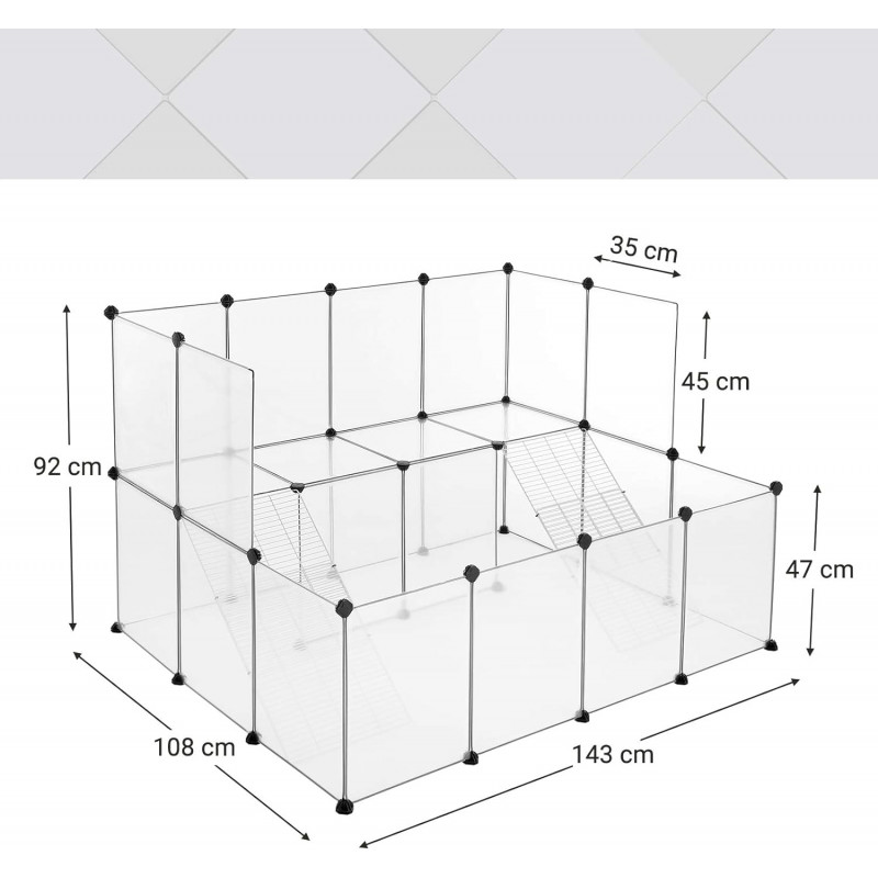 Capacitate de incarcare statica: 10 kg Despre acest articol Aceasta incinta modulara cu balcon, scari si terasa va deveni cu siguranta noul paradis de joaca pentru animalutul tau. Aici prietenul tau pufos poate alerga dupa bunul plac, fara sa iti faci griji ca ar putea fugi sau ca s-ar putea rani.Datorita panourilor din plastic transparent ale acestei custi, nu veti mai rata niciodata cele mai dulci momente ale animalului dvs. de companie.Introduceti panourile PP in conectorii cu unghiuri multiple pentru a crea o cusca stabila. Apoi, bateti usor imbinarile cu ciocanul inclus pentru a elimina spatiile mici.Un refugiu curat: Datorita panourilor PP sigure, animalultul dvs. va avea un refugiu linistit, care poate fi usor curatat cu un burete umed.