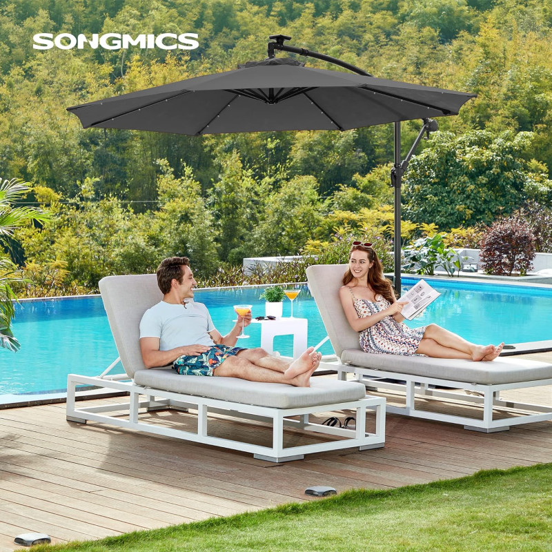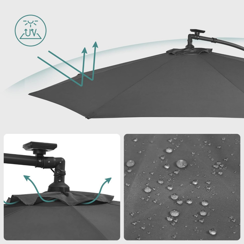 Greutate produs: 13,8 kg Despre acest articol Prelungiti-va bucuria in aer liber: Apusul soarelui nu inseamna sfarsitul unei zile relaxante in aer liber! Cele 32 de lumini LED, alimentate de lumina soarelui si atasate de-a lungul nervurilor umbrelei, creeaza o atmosfera romantica timp de 6 ore!Baldachinul din poliester de 180 g/m² ofera protectie UPF 50+ si blocheaza 98% din razele UV. De asemenea, este hidrofuga pentru a rezista la ploile usoare si nu se decoloreaza usor pentru a va servi pe termen lung.Sustinut de 8 nervuri, acest parasolar cantilever cu baldachin cu un diametru de 3 m poate proiecta o umbra mai larga.Stabil in vant usor? Da!: Are nervuri dreptunghiulare robuste, 2 imbinari intarite cu invelis metalic pe stalp, o sfoara pe baldachin pentru a se atasa la stalp si o gaura de ventilatie in partea de sus care reduce presiunea vantului si permite aerului sa circule.