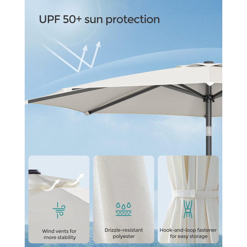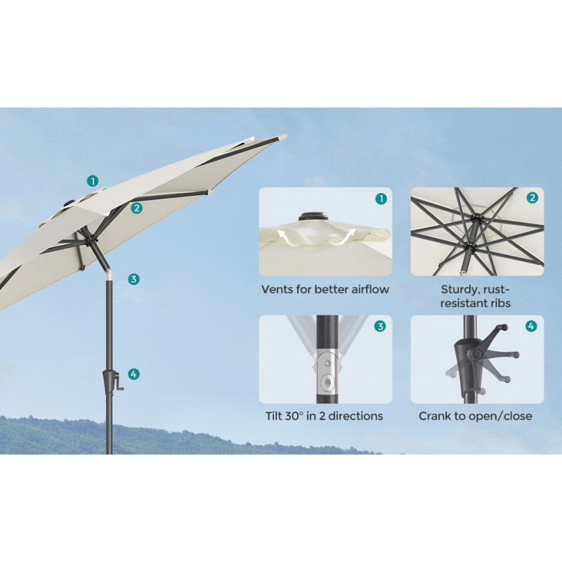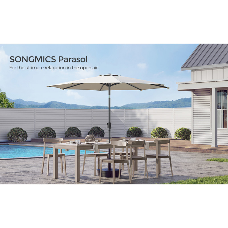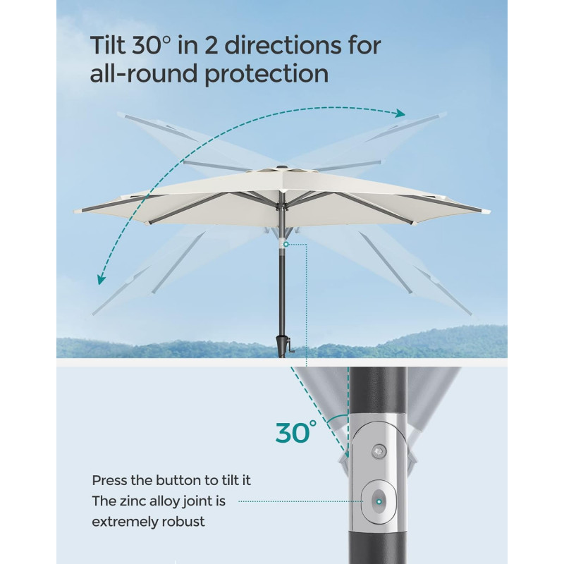 Inaltimea produsului: 2,5 m Despre acest articol Pur si simplu rotiti manivela pentru a deschide si inchide convenabil aceasta umbrela de umbrela. Rapid si usor!Acoperisul acestei umbrele de soare se poate inclina la 30° in 2 directii opuse – trebuie doar sa apasati butonul de pe articulatie pentru a o inclina. Articulatia din aliaj de zinc este mai puternica si mai sigura decat cele obisnuite din aliaj de aluminiu.Baldachinul din poliester de 180 g/m² cu protectie solara UPF 50+ blocheaza mai mult de 98% din razele UV. De asemenea, este hidrofug pentru a va proteja de ploaie.Coastele acestei umbrele de gradina sunt puternice si durabile, deoarece sunt fabricate din otel de calitate acoperit cu pulbere, rezistent la rugina, pentru o durata de viata lunga.Aceasta umbrela de gradina de 3 m poate face umbra la 4-6 persoane in gradina, pe terasa, la marginea piscinei, pe balcon sau in alta parte.