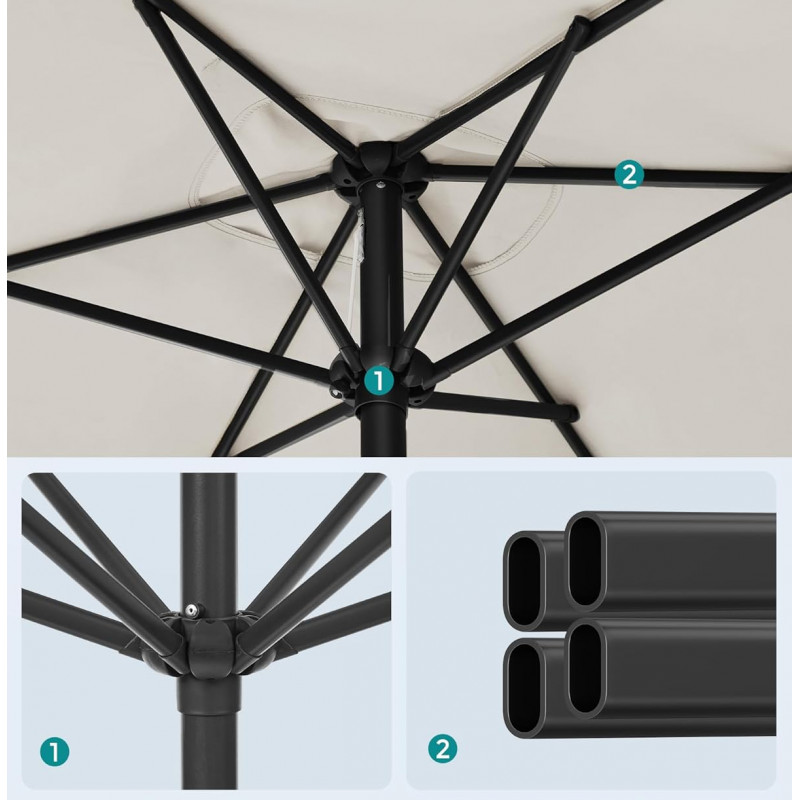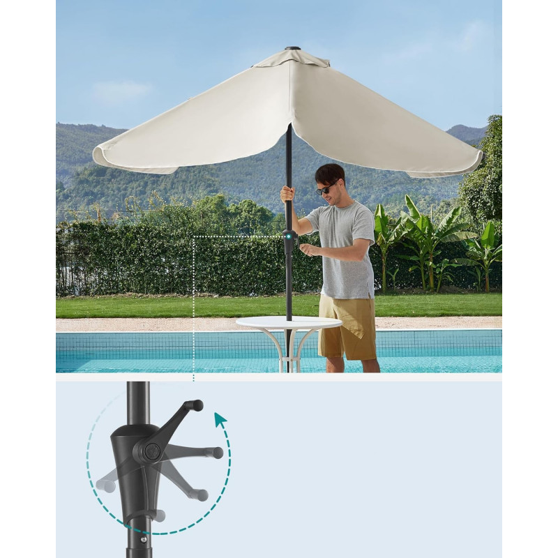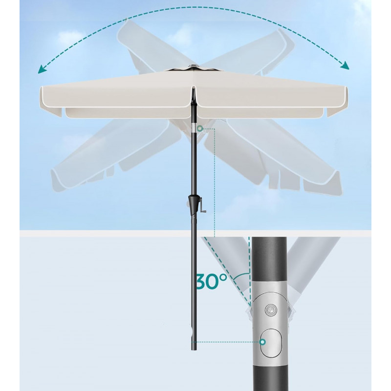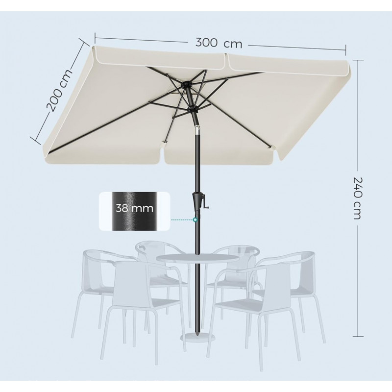 Scurta descriere Umbrela de 300x200 cm este ideal pentru balcon sau terasa, oferind umbra generoasa si protectie eficienta impotriva razelor UV. Sistemul de inclinare pe ambele parti permite ajustarea rapida a unghiului pentru confort pe tot parcursul zilei. Designul simplu si culoarea bej il fac usor de integrat in orice spatiu exterior.