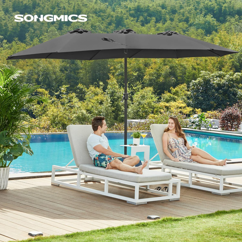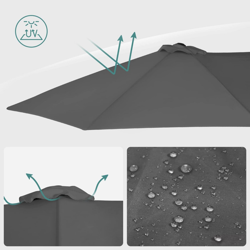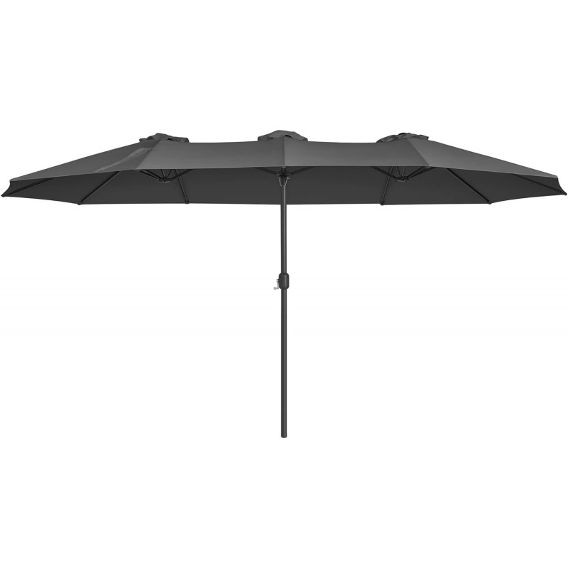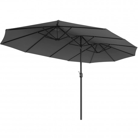 Nu contine suport Despre acest articol Lumina puternica a soarelui? Nu va faceti griji! Panza de umbrela a acestui parasolar dublu ofera o protectie excelenta impotriva razelor UV de pana la UPF 50+: blocheaza cu usurinta 98% din razele UV si va protejeaza pielea de arsurile solare chiar si in cele mai fierbinti ore ale zilei!Este robusta? Bineinteles ca da! Acest lucru este asigurat de cele 12 nervuri metalice de 12 12 x 18 mm ale umbrelei si de un stalp de umbrela robust acoperit cu pulbere (diametru de 48 mm) - simtiti-va in siguranta sub aceasta umbrela robusta si bucurati-va de aerul proaspat in liniste!Culoarea este rezistenta? Da! Stati departe de umbrelele de gradina care isi pierd culoarea in timp, deoarece va fac gradina sa arate fada. Panza acestei umbrele este fabricata din tesatura de poliester 300 D de 180 g/m² si este robusta, durabila si rezistenta la culoare Asamblare? Fara scule. Pur si simplu conectati 2 stalpi impreuna si atasati stalpul umbrelei folosind un suport de umbrela (nu este inclus). Apoi, rotiti in sensul acelor de ceasornic pe manivela pentru a deschide umbrela - gata!Multi prieteni? Bine ati venit! Umbrela de 460 x 270 cm proiecteaza umbrele grozave atunci cand doriti sa organizati o petrecere in gradina. De asemenea, este potrivita pentru evenimente publice si pentru suprafata exterioara a cafenelei sau a restaurantului dvs.