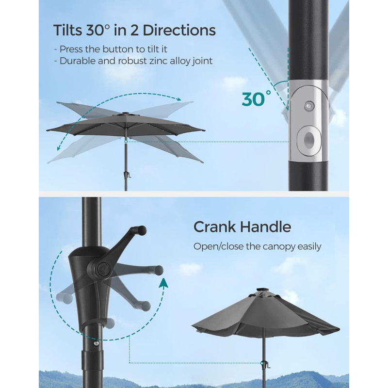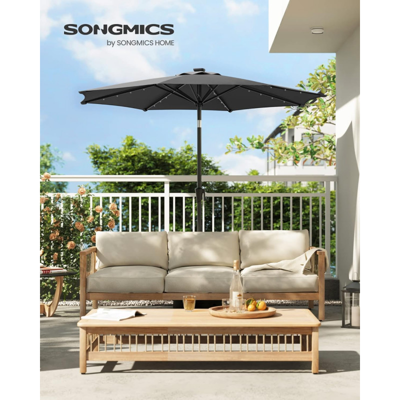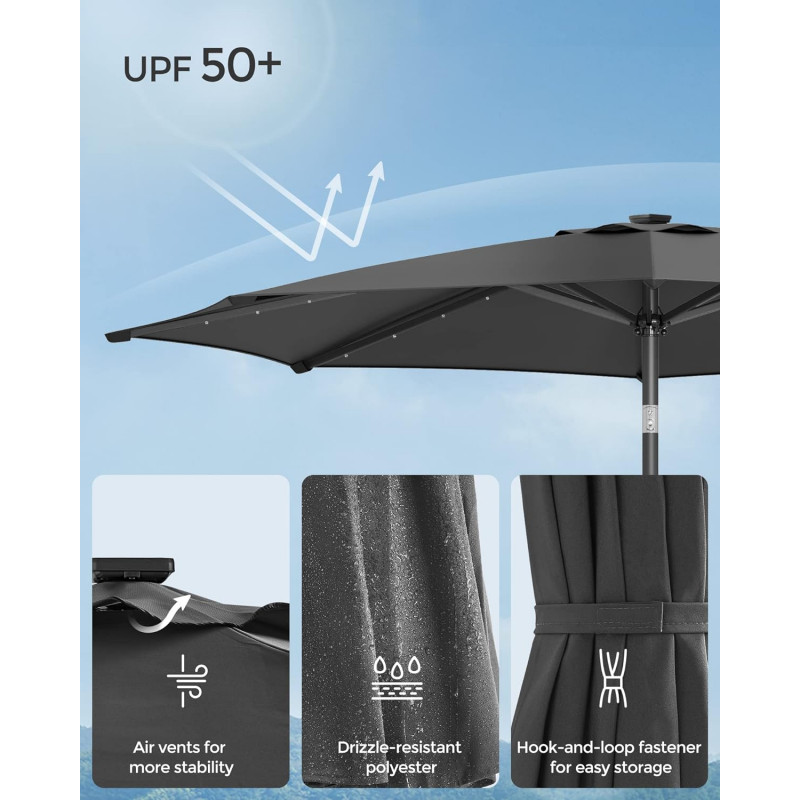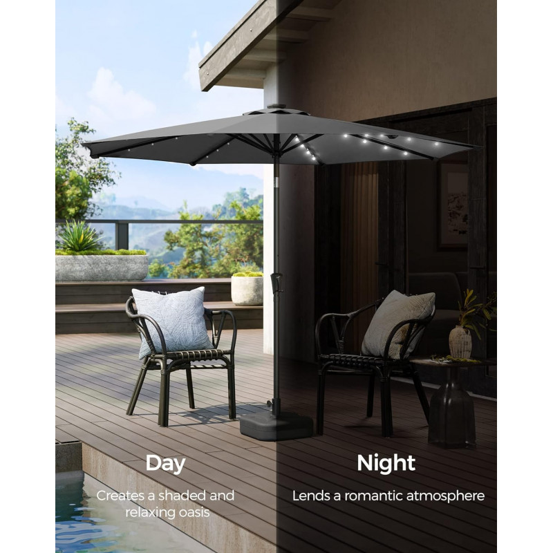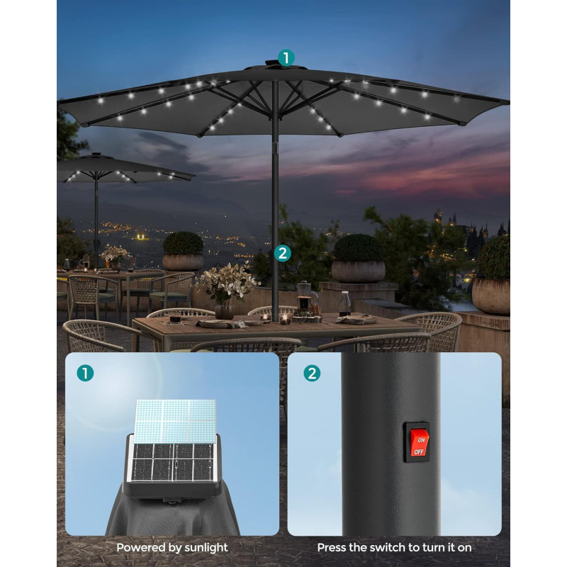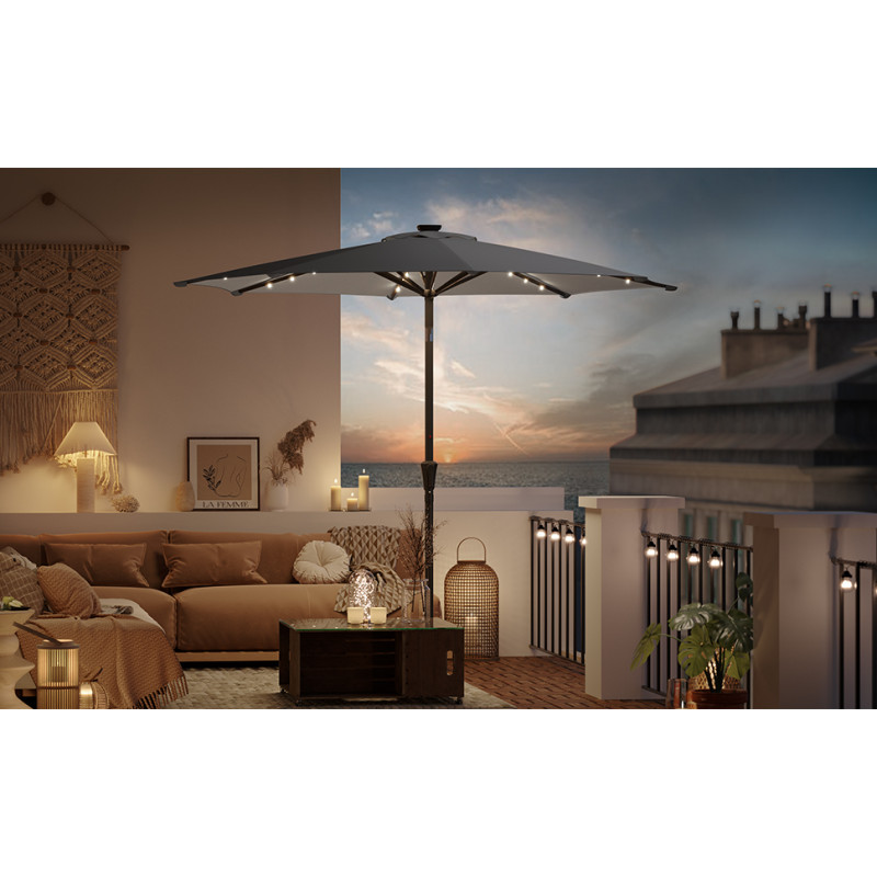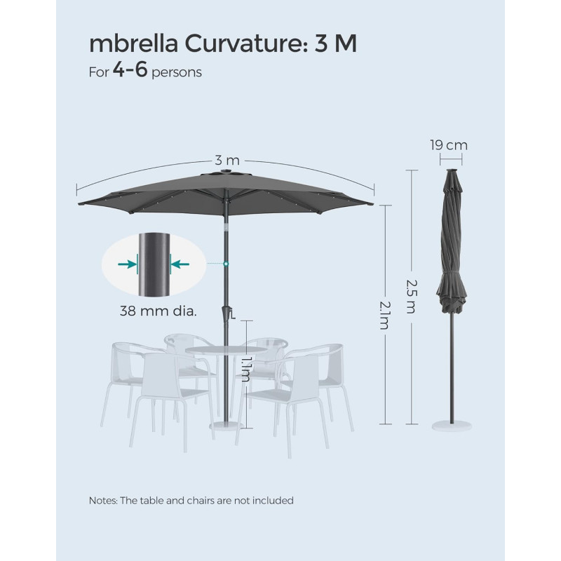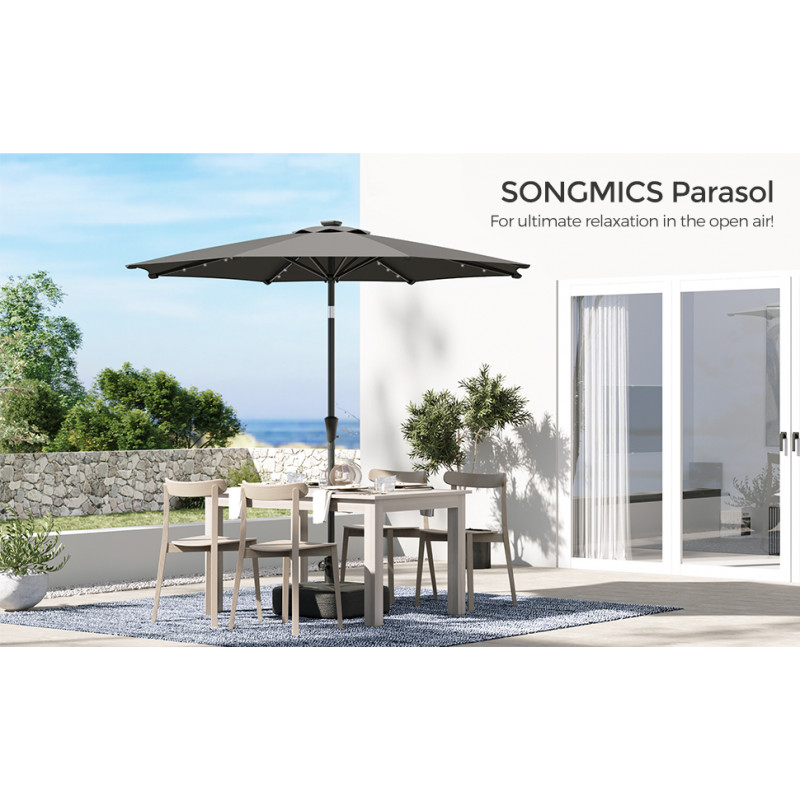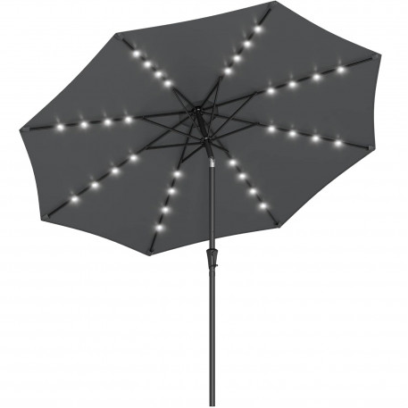 Greutatea produsului: 7,2 kg Despre acest articol Aceasta umbrela de umbrela are 32 de lumini LED alimentate de lumina soarelui, creand o atmosfera romantica seara, atunci cand comutatorul de pe stalp este pornit.Parasolarul din poliester de 180 g/m² cu protectie UPF 50+ blocheaza peste 98% din razele UV. De asemenea, este hidrofug pentru a va proteja de ploaie.Inclinati cu usurinta baldachinul prin apasarea butonului de pe articulatie. Articulatia din aliaj de zinc este mai puternica si mai sigura decat cele obisnuite din aliaj de aluminiu.Pur si simplu rotiti manivela pentru a deschide si inchide convenabil aceasta umbrela de umbrela de 3 m. Rapid si usor!Cadrul acestui parasolar de gradina este puternic si durabil, fabricat din otel de calitate acoperit cu pulbere, rezistent la rugina, asigurand o durata de viata prelungita.