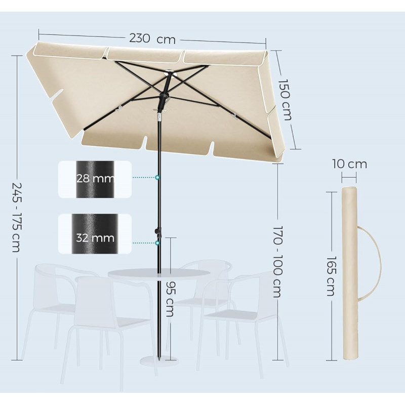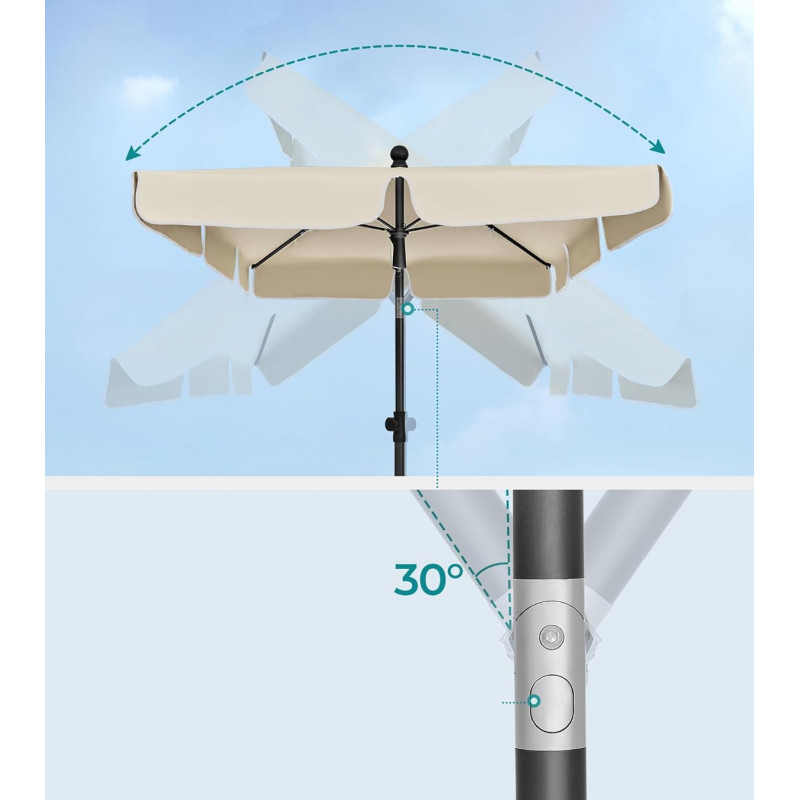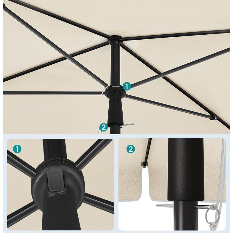 Scurta descriere Umbrela SONGMICS este ideala pentru a crea un spatiu umbros si confortabil in aer liber. Se regleaza usor pe inaltime si se poate inclina in functie de pozitia soarelui, oferind protectie pe tot parcursul zilei. Materialul rezistent asigura protectie impotriva razelor UV si a ploii usoare, fiind perfecta pentru balcon, terasa sau gradina.