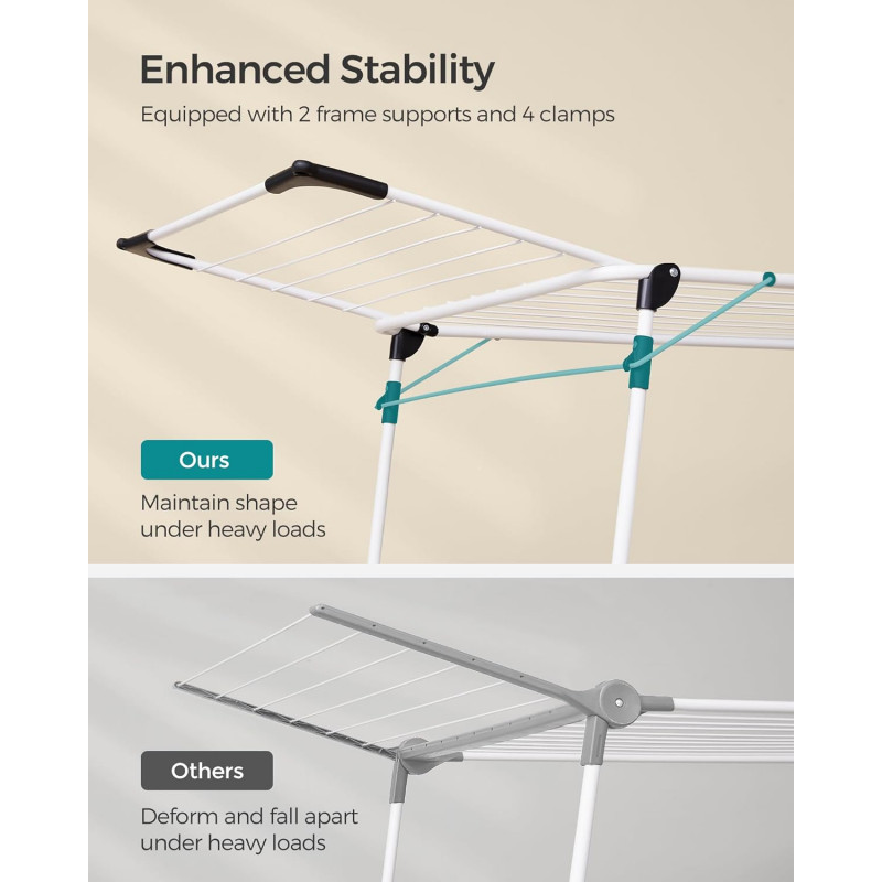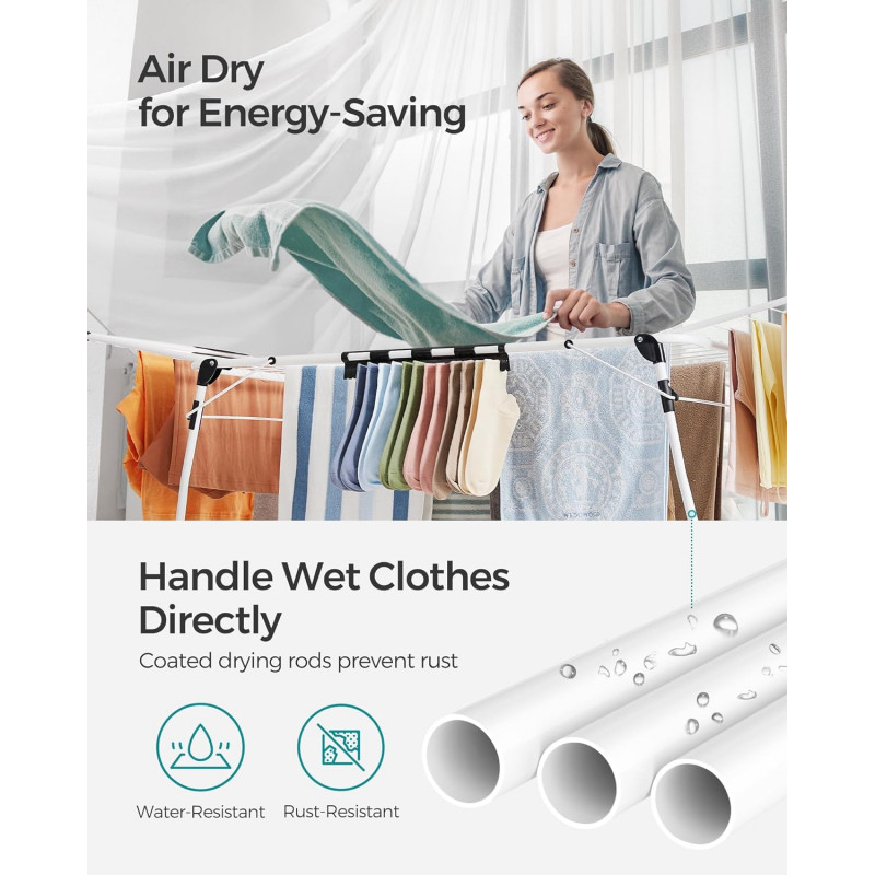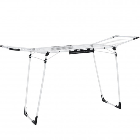 Stabilitate imbunatatita: Constructia consolidata cu 2 suporturi de cadru stabile si 4 cleme asigura o stabilitate ridicata. Uscatorul nostru de rufe nu se misca, chiar daca multe haine sunt atarnate pe el Capacitate mare : Obtineti o suprafata totala de uscare de 18 m lungime cu o capacitate maxima de incarcare de 18 kg si 2 suporturi pentru sosete. Puteti stoca cu usurinta totul, de la articole mici de rufe delicate pana la rufe voluminoase Pliabil si rezistent la rugina - Cand nu aveti nevoie de suportul de uscare independent, il puteti plia cu usurinta si il puteti depozita pentru a economisi spatiu. Tijele de rufe au un strat rezistent la rugina, astfel incat sa puteti atarna hainele ude fara griji Eficient si economic - Procesul delicat de uscare cu aer economiseste energie, mentinandu-va hainele in stare perfecta si prelungindu-le durata de viata. Nu necesita asamblare, gata de utilizare odata ce este desfacuta Pentru utilizare in interior si in exterior: Uscatorul nostru de haine cu aripa stabila poate fi utilizat atat in interior, cat si in exterior. Fie pe balcon, in baie, in gradina sau in spalatorie, va puteti usca rufele in functie de nevoile dvs.