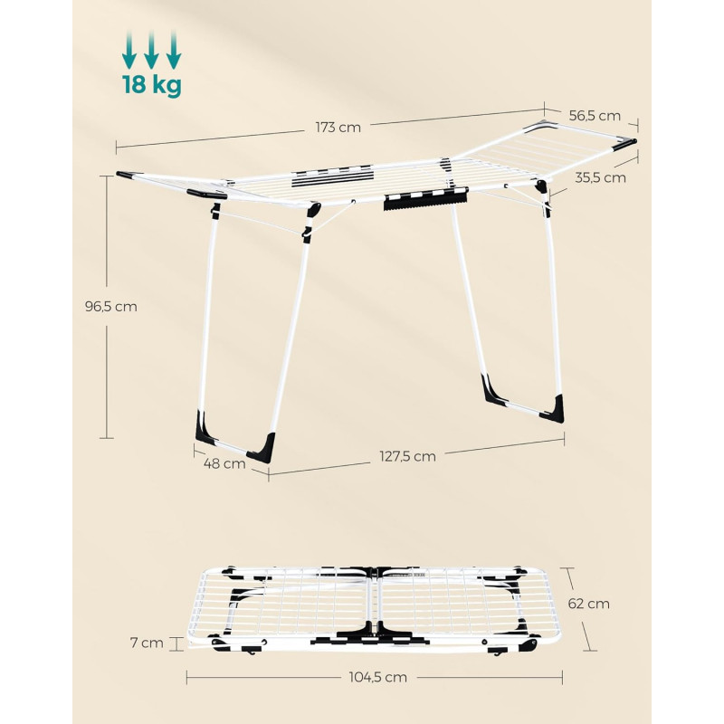 Pachetul include: 1 x Uscator de rufe1 x set de accesorii1 x manual de utilizare Note SONGMICS: Sarcina maxima a aerisitorului de rufe este de 18 kg. Va rugam sa nu depasiti aceasta greutate maxima.- Distribuiti greutatea hainelor uniform pe suport pentru a le mentine in echilibru.- Asigurati-va ca uscatorul de rufe este asezat pe o podea plana inainte de utilizare. In caz contrar, acesta se poate rasturna, ceea ce poate cauza raniri sau deteriorarea suportului.- Nu lasati uscatorul afara pentru o perioada lunga de timp. Este foarte recomandat sa pliati suportul imediat dupa utilizare si sa il depozitati in interior.