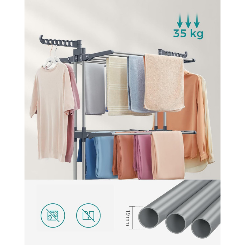 Solid si durabil: Acest uscator de rufe mare este fabricat din otel inoxidabil rezistent si plastic gros, cu tije duble ranforsate pe ambele parti. Este mai solid decat un uscator obisnuit si se mandreste cu o durata de viata mai lunga, fiind capabil sa suporte pana la 35 kg.
