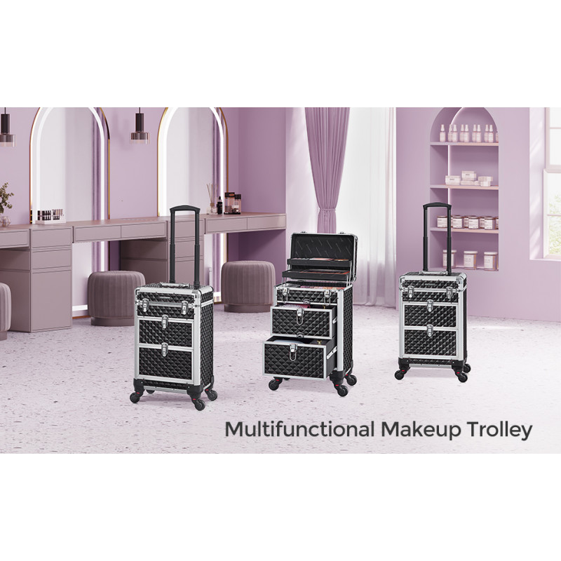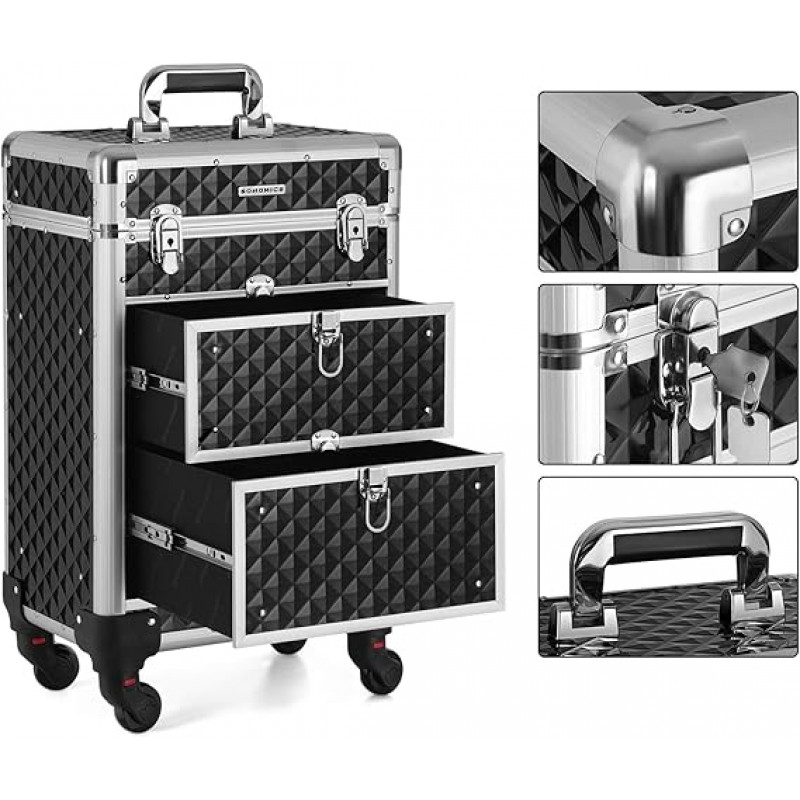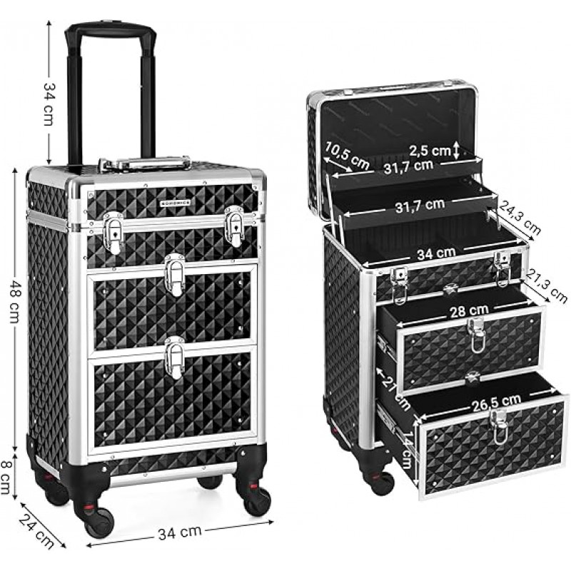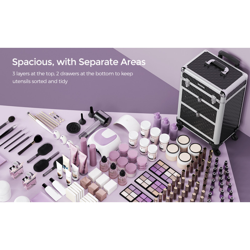 Capacitate de incarcare statica maxima: 10 kg Despre acest articol Deschideti capacul acestei cutii de machiaj cu chei si straturile superioare se deschid in acelasi timp. Trageti cu usurinta sertarele inferioare cu inchizatoare pentru acces usor la articolele din interior. Fabricata din plastic de calitate, suprafata sa este rezistenta la apa si usor de curatat. Cadrul din aluminiu si protectiile pentru colturi il fac solid si rezistent la socuri (capacitate de incarcare de 10 kg). Intarite cu elemente de fixare hook-and-loop, manerul telescopic este durabil. 3 straturi superioare cu separatoare va pastreaza articolele mici, cum ar fi rujurile si fardurile de ochi, organizate in categorii. 2 sertare inferioare mari sunt pentru uscatorul dvs. de par si lampa de unghii UV. 4 rotite sunt detasabile, usor de instalat si rotative la 360 °, astfel incat sa puteti rula cu usurinta acest troler de frumusete oriunde. Cu cheia inclusa, puteti bloca geanta in timpul deplasarii pentru a preveni caderea articolelor dvs.