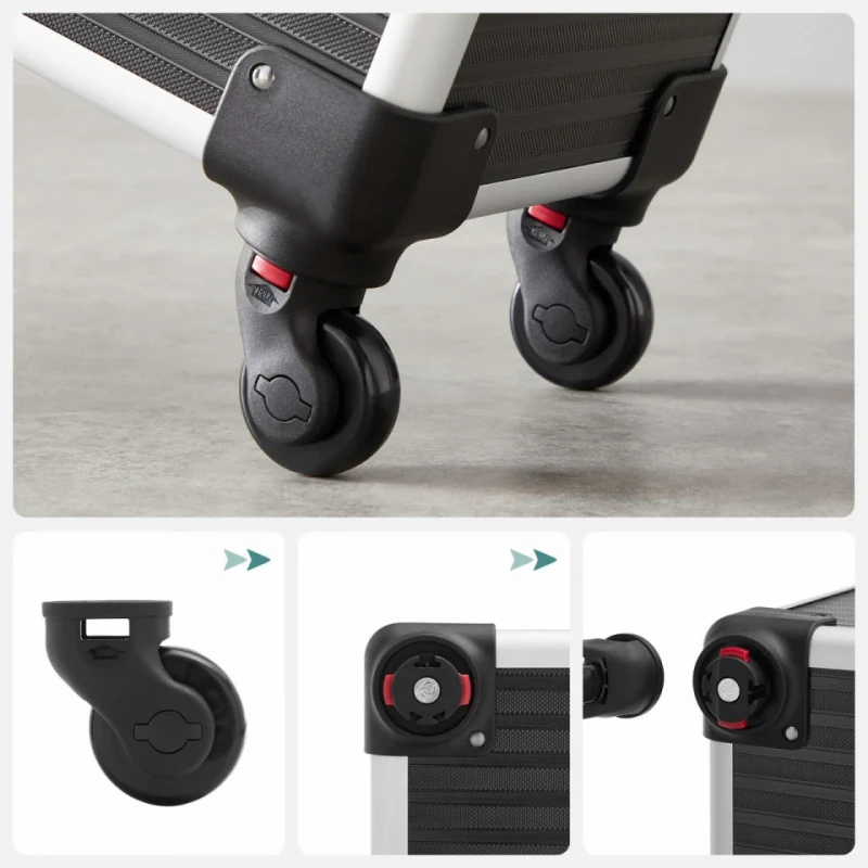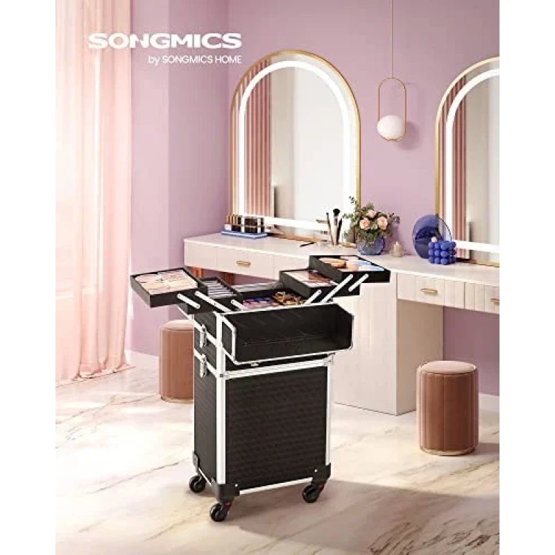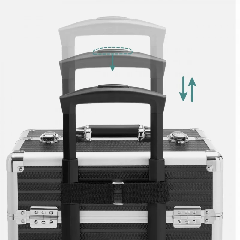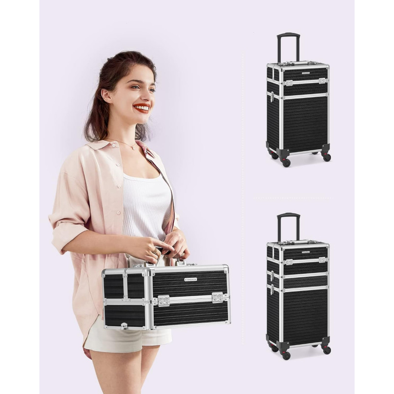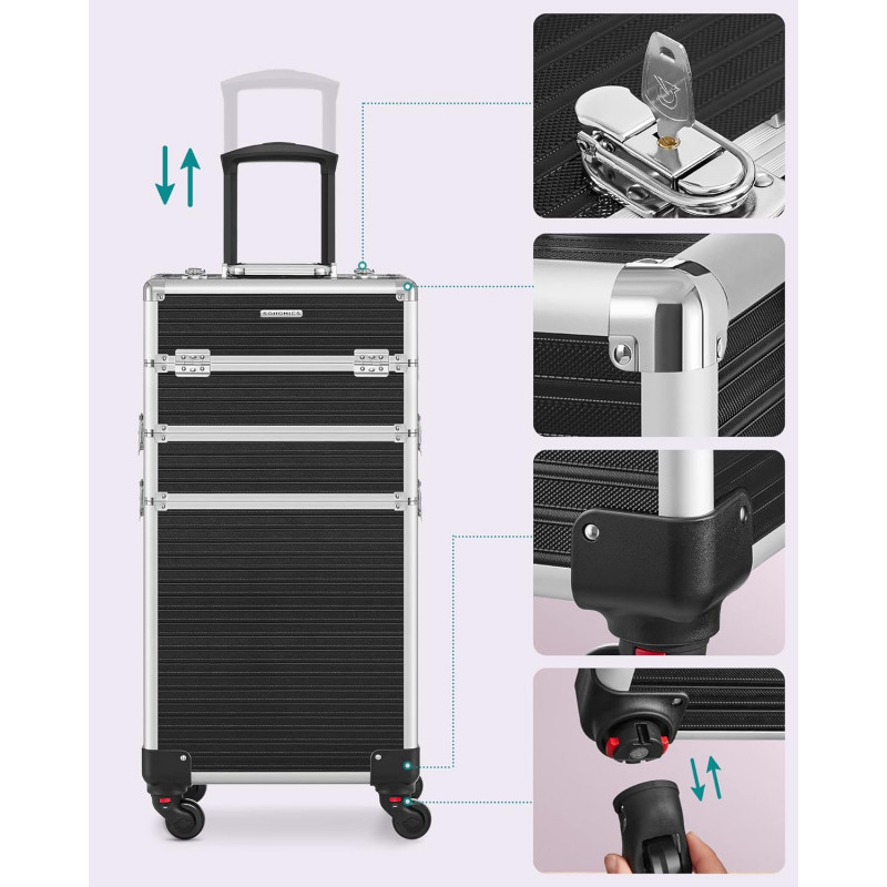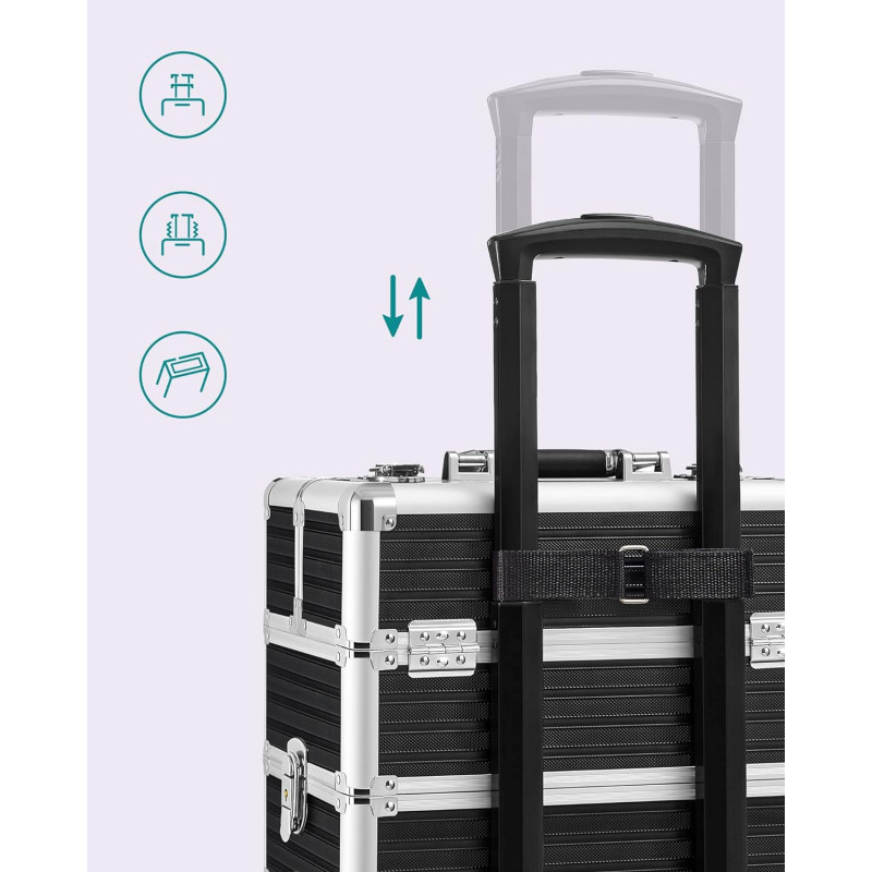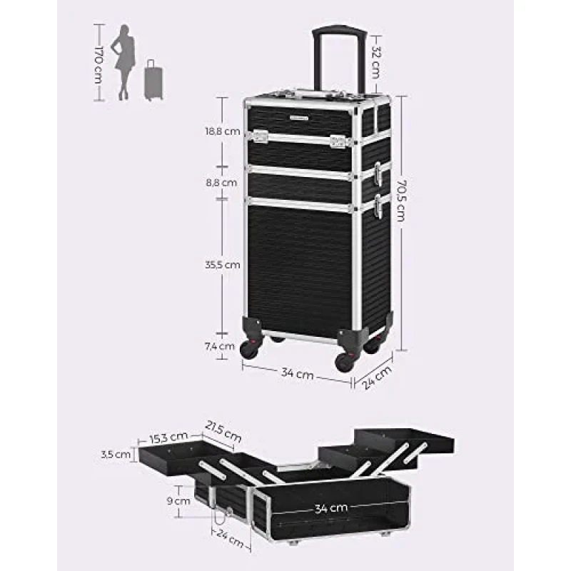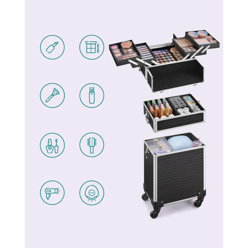 4x chei Un troller de machiaj cu 4 roti si 4 chei pentru a-ti proteja obiectele personale, un companion practic pentru calatoriile de afaceri, care este o idee de cadou ideala! Pentru colectia ta in crestere de produse cosmetice : Acest troller de cosmetice mare ofera o multime de spatiu de depozitare pentru machiajele tale: compartimente multiple pentru rujuri si farduri de ochi si un compartiment mare pe partea de jos pentru haine sau uscatorul de par. Calatoreste linistit cu acest troller : Placi MDF durabile, margini din aluminiu robuste, un maner telescopic ajustabil, o suprafata din plastic ABS usor de intretinut - acest troller de machiaj este un companion practic in calatoriile tale. Cu roti sau fara? Decizia ta!: Trollerul de cosmetice este echipata cu roti universale si poate fi usor impins in locul dorit. Desigur, poti indeparta, de asemenea, rotile daca doresti si sa ill fixezi intr-un singur loc. Un cadou care vine din inima : Ofera celor dragi care calatoresc des sau mult acest troller de cosmetice - cu siguranta vor straluci de fericire.