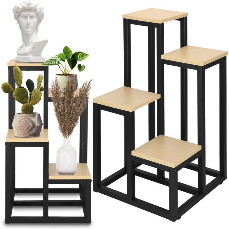 Rafturi din tabla de mobilier asemanatoare lemnului, in culoarea: bej. Suportul pentru flori pe mai multe niveluri este o solutie extrem de practica si eficienta pentru iubitorii de plante care cauta constant idei noi pentru expunerea florilor si pentru cei carora le lipseste spatiu pentru ghivece. Un suport metalic care poate tine 4 ghivece de plante va va permite sa umpleti colturile goale anterior cu verdeata si sa profitati la maximum de uzura in locuri precum: camera de zi, scara, hol, birou, sala de asteptare, gradina de iarna.Suportul de flori metalic este proiectat intr-un stil modern de mansarda si cu siguranta va adauga un caracter industrial oricarui interior. Suportul geometric, in afara de functia sa de baza, este un decor in sine. Este un decor interesant pentru camera de zi, dormitor, hol, sala de asteptare, restaurant sau birou.Suportul de flori poate sustine pana la patru ghivece si functioneaza la fel de bine pentru florile cu frunze mari, agatate, ca si pentru cele mai mici, cum ar fi suculentele. O idee buna ar fi sa folositi aceasta piesa de mobilier si ca loc pentru ghivece cu ierburi . Veti crea o compozitie unica cu ea , care va adauga atmosfera interiorului si, in acelasi timp, va economisi spatiu si va usura ingrijirea, avand plantele dvs. intr-un singur loc. Rasfata-te cu un pic de gradina in confortul casei tale.