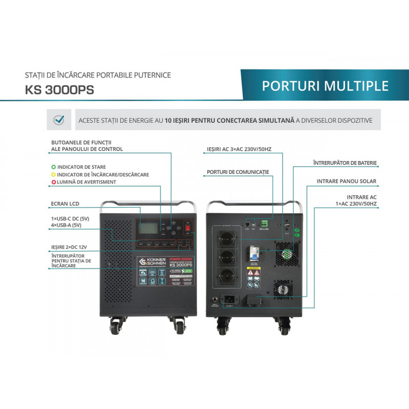 Noile stații de încărcare portabile puternice de la Könner & Söhnen® reprezintă o soluție inovatoare caracterizată prin fiabilitate, mobilitate, eficiență economică și siguranță ecologică. Aceste dispozitive moderne multifuncționale combină o baterie reîncărcabilă, un invertor solar cu capacitatea de a conecta panouri solare și un sistem de alimentare neîntreruptibilă cu un val sinusoidal pur.