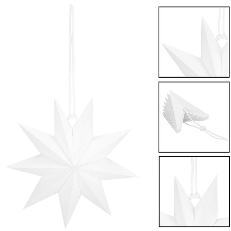 folositi-l pentru a va decora gradina, agatandu-l de o ramura de copac in timpul evenimentelor in aer liber DECORATIE UNIVERSALA Acest design unic, realizat din carton gros, poate fi plasat oriunde! Este o idee excelenta pentru decorarea tavanelor, usilor sau ferestrelor. Cu ajutorul cordonului, puteti atarna decoratiunea noastra eleganta pe galerii de perdele, lampi, clante, carlige sau o puteti sprijini oriunde.Daca o atarnati pe o tija de perdea, steaua va deveni vizibila din exterior pentru trecatori si pentru oaspetii care vin. Puteti crea un efect frumos atarnand-o pe o ghirlanda de Craciun impreuna cu alte decoratiuni. Un mod la fel de ingenios de a folosi acest decor este de a crea o intreaga constelatie pe perete, formata din mai multe decoratiuni similare. Ornamentul nostru cu stea, realizat artistic, are un model frumos de tip openwork. Precizia si atentia la detalii cu care au fost decupate fiecare gaura in parte sunt uimitoare. Puteti plia si desfasura singur acest decor unic cu mare usurinta, tragand de cordon. Dupa ce ati terminat de folosit, il veti depozita convenabil in orice sertar, deoarece acest produs ocupa foarte putin spatiu atunci cand este pliat. SE PLIAZA IN CATEVA SECUNDE! 1 Scoateti steaua din ambalaj.2. Trageti de extractor.3 Agatati-l oriunde.4. Atunci cand este pliata, se poate depozita cu usurinta - ocupa foarte putin spatiu. PARAMETRI: