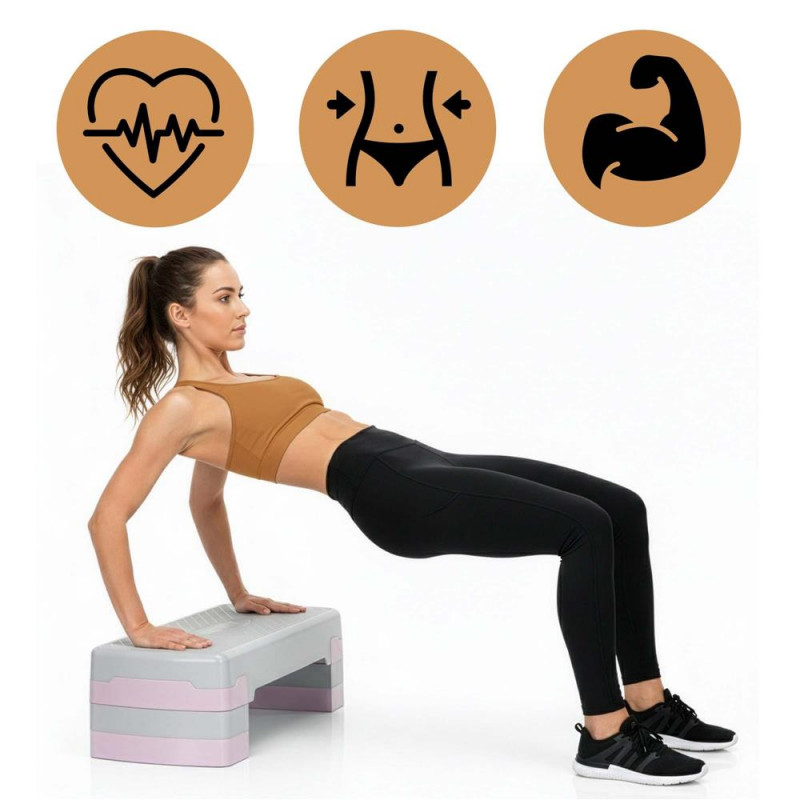Scurta descriere: Podest aerobic reglabil, conceput pentru antrenamente de fitness si aerobic acasa sau la sala. Structura solida permite ajustarea inaltimii in functie de nivelul de dificultate dorit, oferind stabilitate si siguranta in utilizare.