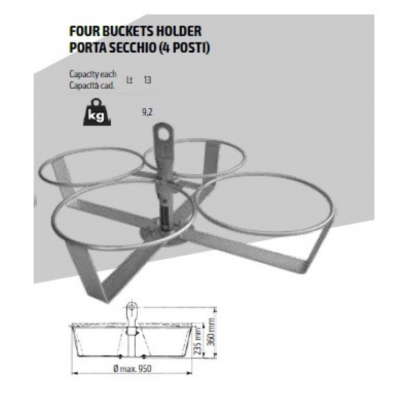 Accesoriu de ridicare care permite transportul simplu și sigur a 4 găleți simultan, cântărește 9,2 kg și permite o încărcare de aproximativ 100 de litri de material.