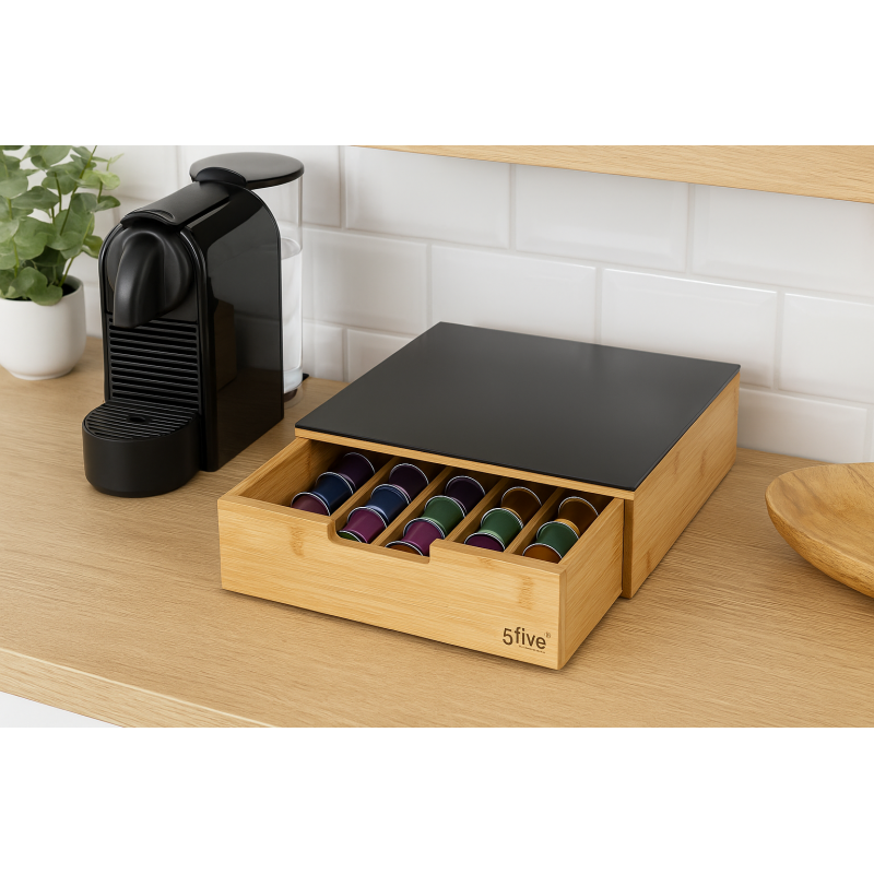 Scurta descriere Suportul pentru capsule de cafea Blackbamboo de la 5 Five imbina eleganta contemporana cu naturaletea materialelor ecologice. Realizat din bambus si sticla, dispune de un sertar practic pentru organizarea capsulelor si un design compact, perfect pentru un colt de cafea ordonat si estetic.