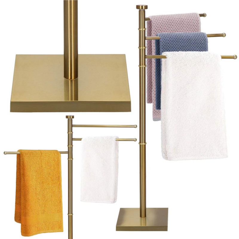 Capacul stalpului: diametru 4,2 cm, inaltime 1,2 cm Un suport pentru prosoape cu trei brate pentru baie este un plus functional pentru interior. Produsul extrem de simplu si in acelasi timp foarte aratos este perfect ca loc pentru uscarea prosoapelor umede, ca uscator de rufe sau pentru agatat accesoriile de baie. Suportul are trei brate care pot fi rotite. Datorita acestui lucru, este foarte usor sa ajungi la prosopul tau sau sa le asezi corect in timp ce uscati hainele. Baza de forma rotunda are un tampon care protejeaza impotriva zgarieturilor. In plus, grosimea bazei de aproximativ 2 cm garanteaza stabilitatea suportului