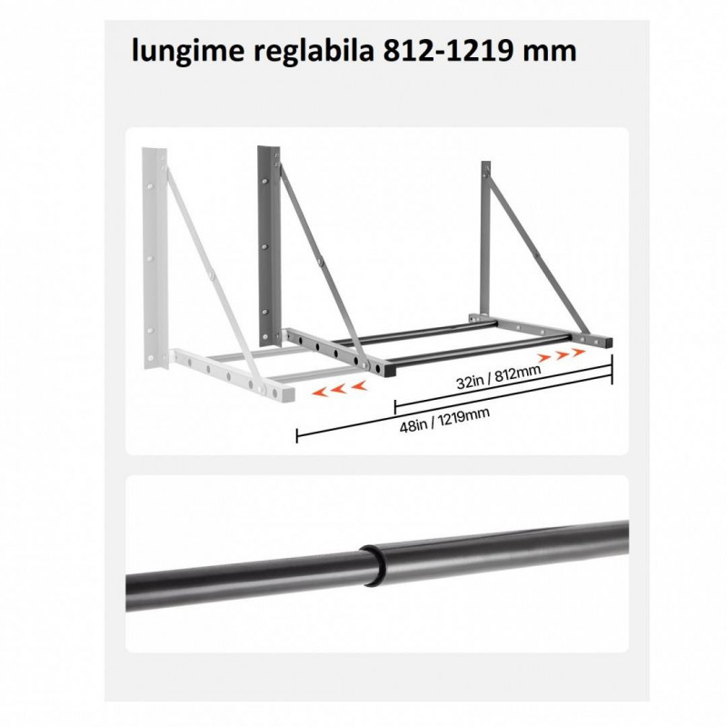 Ajustare flexibila a lungimii: Barele de sprijin reglabile ale acestui suport pentru anvelope montat pe perete se pot extinde de la 812-1219 mm, adaptandu-se la diferite dimensiuni de perete si satisfacand diferitele nevoi de depozitare.