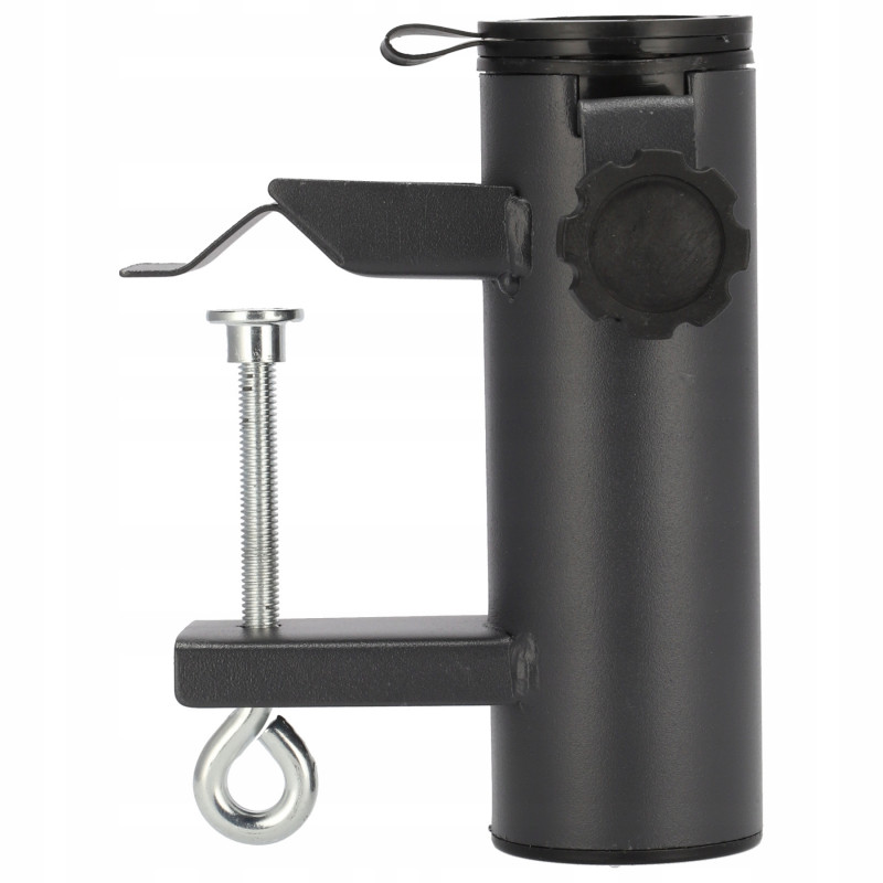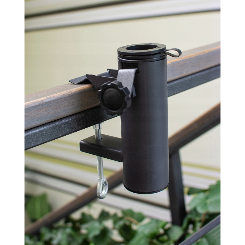 Culoare neagra Un maner solid care va permite sa montati umbrela pe o balustrada de balcon, terasa sau alte locuri. Poate fi folosit atat pentru balustrade rotunde, cat si pentru balustrade plate. Este solutia perfecta care te va proteja pe tine si spatiul tau de soare excesiv sau ploi persistente, permitandu-ti sa te bucuri de relaxare in aer liber.