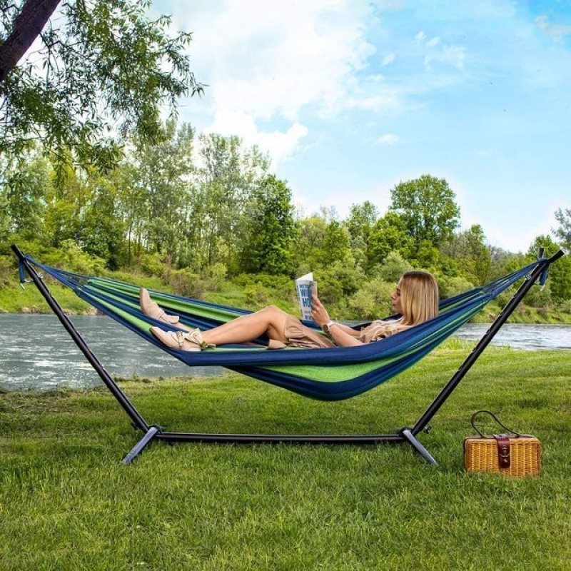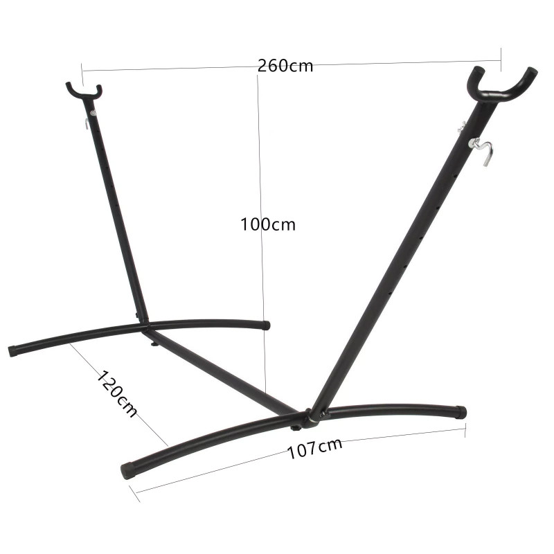 Odihniti-va acasa in gradina, sau oriunde in aer liber. Suportul pentru hamac puteti asambla oriunde doriti. Dupa asamblare nu aveti alta treaba decat sa agatati hamacul pe suport si sa va relaxati. Nu trebuie sa-l folositi neaparat in aer liber, si o camera mai mare sau o terasa poate fi locul perfect. Este conceput din otel, arata bine in orice mediu, incapere. In pachet veti gasi toate suruburile necesare, asamblarea este usoara. In pachet veti gasi si doua carlige, cu ajutorul acestora puteti fixa hamacul de suport.Distanta dintre cele doua capete poate fi reglat la 6 nivele.
