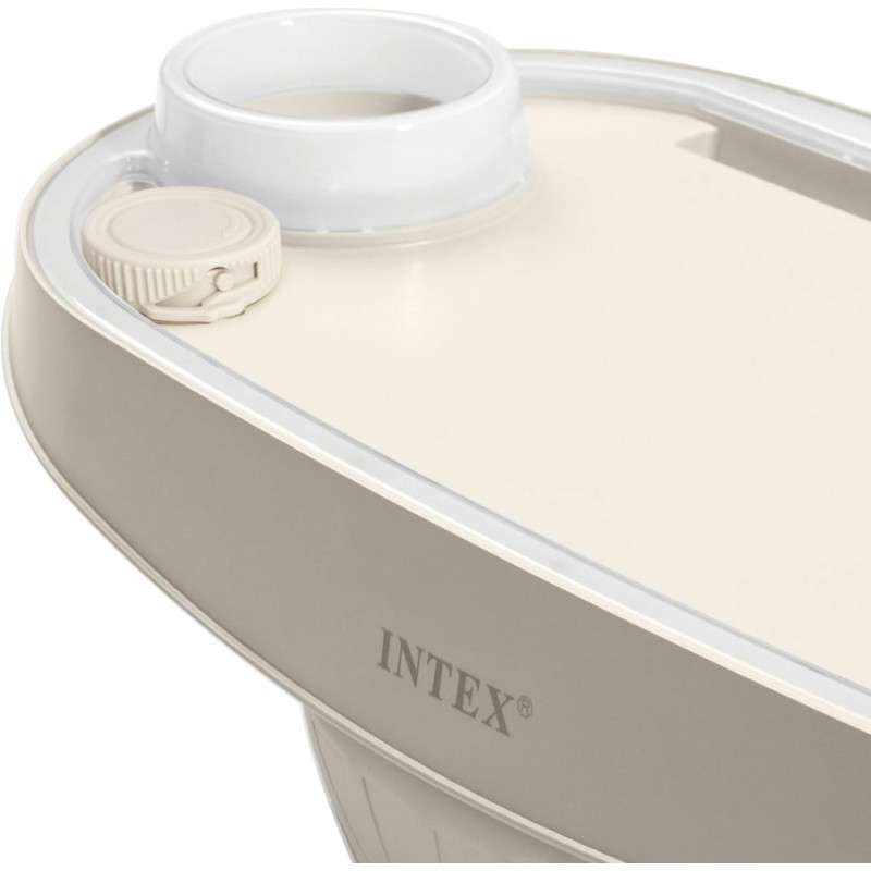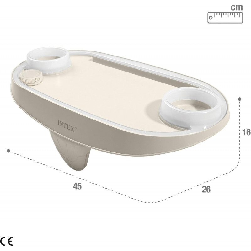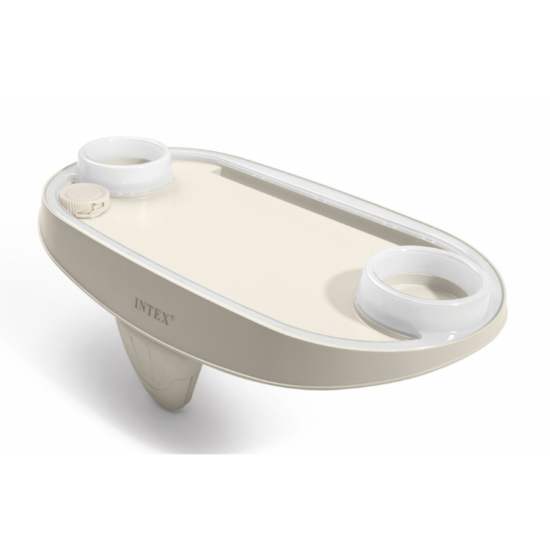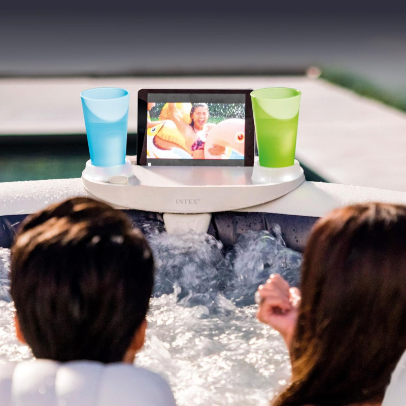Intex 28520 este un accesoriu practic si modern conceput special pentru gama de jacuzzi Pure Spa. Creat pentru a imbunatati experienta de relaxare, acest suport ofera spatiu dedicat pentru bauturi, gustari si dispozitive mobile precum tableta sau telefonul. Structura este prevazuta cu doua suporturi de ceasca integrate, fiind ideala pentru servirea bauturilor preferate in timp ce te bucuri de hidromasaj. In partea centrala se afla un spatiu suplimentar care permite sprijinirea unui smartphone sau a unei tablete, astfel incat sa poti urmari continut multimedia sau sa citesti in timpul baii. Un detaliu distinctiv il reprezinta banda LED care contureaza discret suportul, oferind o lumina ambientala placuta pe timp de seara. Functioneaza cu doua baterii CR2032 (neincluse), ceea ce permite utilizarea fara cabluri sau surse externe de alimentare. Suportul este usor de montat si compatibil cu toate modelele de jacuzzi din gama Intex Pure Spa. Este rezistent la stropire si ofera o solutie eleganta si utila pentru a mentine accesoriile la indemana in timpul relaxarii. Specificatii tehnice