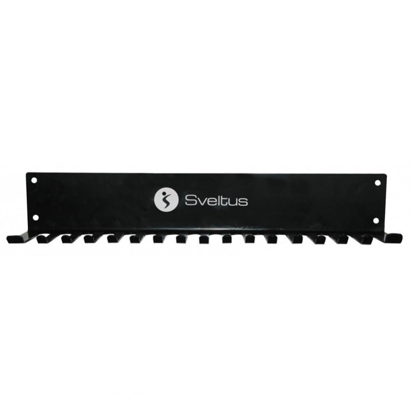 Suportul pentru benzi elastice si corzi de sarit este ideal pentru optimizarea si organizarea spatiului in salile de fitness.Capacitate variabila in functie de articolele stocate.Constructie metalica foarte rezistenta.Culoare: negru.Greutate: 2 kg.Dispune de 17 carlige de depozitare. Vine cu 4 suruburi de fixare incluse.Dimensiune: 60 x 12 x 10 cm Producator: Sveltus