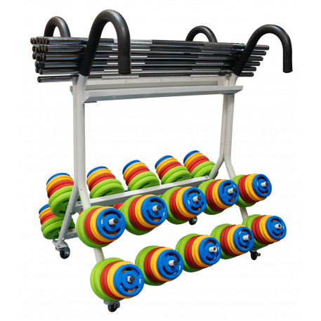 Suport pentru Kit Pump de calitate ridicata, ideal pentru salile de fitness si aerobic.Capacitate de stocare: 20 Kit Pump de 16 sau 20 kg.Structura metalica, prevazut cu patru roti pentru transport si sistem de franare.Lungime carlige 22 cm.Pentru discuri cu interiorul de ø28mm.Dimensiune produs: 98 x 136 x 93 cm.Culoare: gri.Greutate: 35.5 kg.Producator: SVELTUS