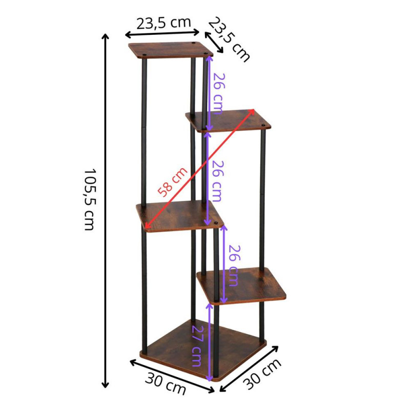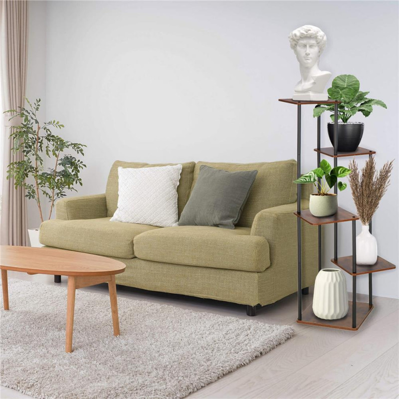 Suportul pentru flori cu 5 rafturi este solutia perfecta pentru organizarea plantelor intr-un mod elegant si practic. Cu un design modern, realizat din metal rezistent si blaturi din placa de mobilier in nuanta maro deschis , acest suport adauga un plus de stil oricarui spatiu.