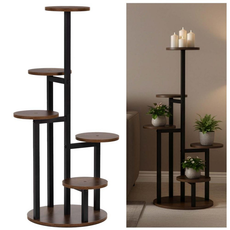 Scurta descriere: Suport decorativ pentru plante cu 5 polite rotunde din lemn si structura metalica stabila. Designul vertical permite expunerea plantelor in mod organizat, economisind spatiu. Potrivit pentru interior sau spatii acoperite.