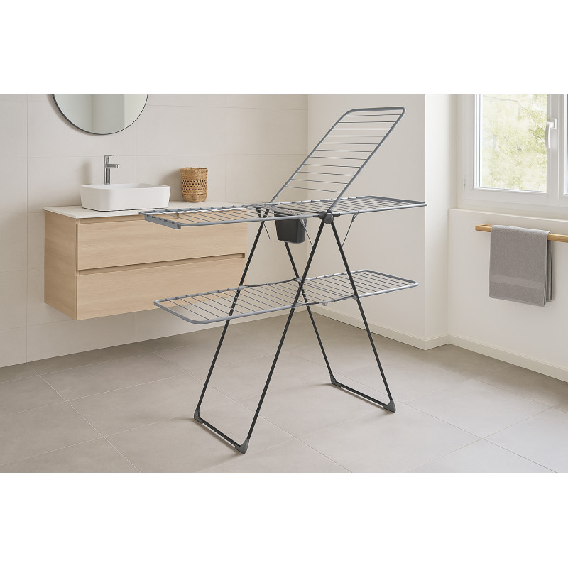 Scurta descriere Uscatorul de rufe Mojave de la Atmosphera este solutia ideala pentru uscarea eficienta a rufelor in spatii restranse. Designul sau vertical cu aripi laterale rabatabile ofera pana la 31 m de spatiu de uscare, structura robusta din otel asigurand stabilitate si durabilitate.