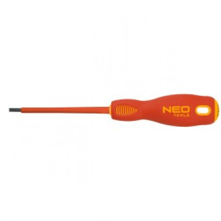 Surubelnita cu cap plat NEO 1000V (ref. 04-053) cu dimensiunile 4,0 x 100 mm. Aprobata pentru lucrul sub tensiune de pana la 1000V. Lama surubelnitei este fabricata din otel durabil S2. Varful de lucru al lamei a fost tratat termic, rezultand o duritate si o rezistenta la indoire corespunzatoare. Surubelnita are un varf magnetic. Forma triunghiulara a manerului cu suport pentru degetul mare conturat reduce efortul asupra mainii in timpul lucrului si faciliteaza obtinerea unui cuplu optim. Manerul din doua materiale previne alunecarea in mana si este rezistent la substante chimice, uleiuri si grasimi. Calitatea sculei confirmata de certificatul TÜV si de garantia producatorului de 25 de ani. Marca NEO raspunde asteptarilor profesionistilor. Otel