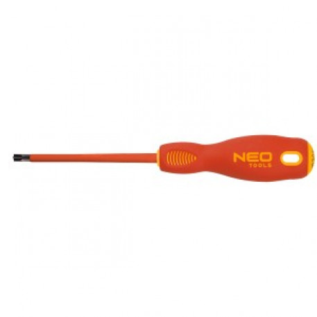 Surubelnita cu cap plat NEO 1000 V (ref. 04-221). Certificata pentru lucrul sub tensiune de pana la 1000 de volti. Lama surubelnitei este fabricata din otel S2 foarte rezistent. Varful de lucru al lamei a fost tratat termic, rezultand o duritate si o rezistenta la indoire corespunzatoare. Varful special este dedicat sigurantelor de tip S. Forma triunghiulara a manerului cu suport pentru degetul mare conturat reduce sarcina pe mana in timpul lucrului si faciliteaza obtinerea unui cuplu optim. Manerul din material dublu previne alunecarea in mana si este rezistent la substante chimice, uleiuri si grasimi. Calitatea sculei este sustinuta de o garantie de 25 de ani din partea producatorului. otel