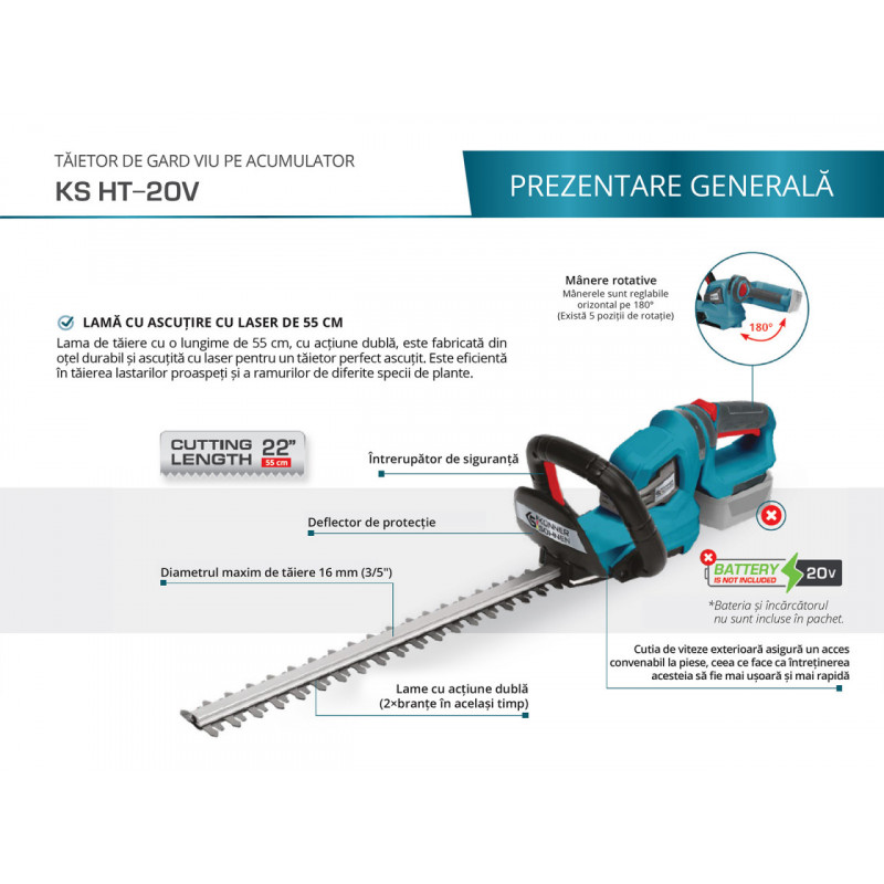 Tăietorul de gard viu funcționează cu un acumulator Li-Ion de 20V de la 2 la 8 Ah - acesta este un instrument din gama de echipamente de grădinărit Könner & Söhnen® bazată pe un sistem unic de acumulatoare. Se remarcă prin viteză înaltă de încărcare și timp redus de inactivitate.