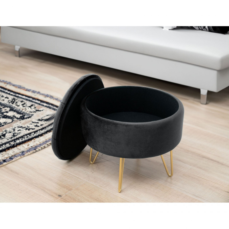 Scurta descriere: Pufa CARO in nuanta negru este un accesoriu elegant si versatil pentru living sau dormitor. Tapiteria din velur ofera confort si un aspect rafinat, iar picioarele metalice aurii completeaza designul modern cu un accent glam. Capacul rabatabil ascunde un compartiment practic pentru depozitarea obiectelor utilizate ocazional.