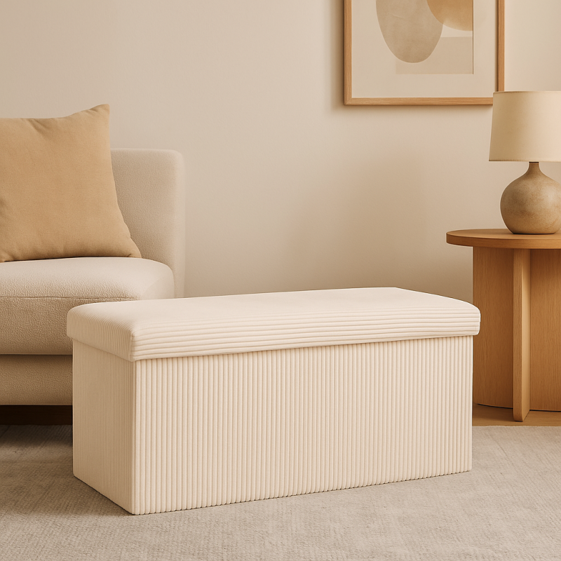 Scurta descriere Taburetul dublu pliabil Arum de la Atmosphera imbina eleganta si functionalitatea intr-un design minimalist. Realizat din material tip catifea cu dungi, in nuanta ivoire, aduce luminozitate si rafinament spatiului, oferind in acelasi timp confort si spatiu generos pentru depozitare.