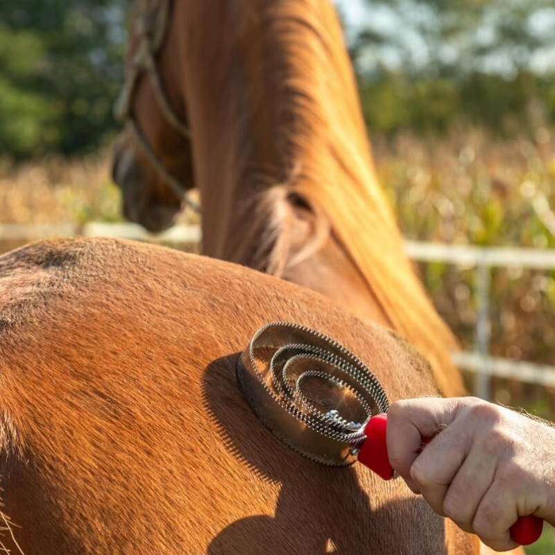 din plastic, pentru curățarea pielii și părului bovinelor și cabalinelor.