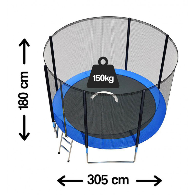 Specificatii: - diametrul trambulinei: 305cm- inaltimea plasei de siguranta: 180cm- inaltimea trambulinei: 70cm- sarcina maxima: 150kg- invelis din polipropilena si fibra de carbon lipita termic- constructie din otel calit- 54 de arcuri galvanizate- invelis cu arcuri in doua straturi (PVC + spuma)- 3x picioare din otel calit cu sistem UIncluse:- trambulina de gradina- plasa de siguranta- scara- protectie de arcuri- covor de spuma (60x25x0,5 cm)- 2 perechi de sosete antiderapante (2 dimensiuni: S-14cm, M-16cm)- creta colorata